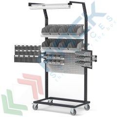 Il carrello con struttura aerea illuminata rappresenta una soluzione completa e versatile per l'organizzazione dei materiali e l'assemblaggio di prodotti. Grazie ai bracci estensibili e alle mensole integrate, permette di installare contenitori a bocca di lupo e cassettiere trasparenti, garantendo un'organizzazione ordinata e ragionata di minuteria, viteria e tutti i kit necessari per le operazioni di assemblaggio. La zona inferiore del carrello rimane libera per consentire il posizionamento di un banco da lavoro, offrendo così un piano dedicato alle lavorazioni e all'assemblaggio. La struttura è completata da un sistema aereo dotato di lampada per un'illuminazione ottimale della postazione, una pratica maniglia laterale per la movimentazione e quattro ruote in gomma antitraccia sintetica da 125 mm di diametro, di cui due fisse e due girevoli con freno per garantire stabilità e manovrabilità. Realizzato in lamiera verniciata nei colori grigio antracite RAL 7016 e grigio RAL 7035, il carrello offre una portata fino a 300 kg ed è fornito smontato per una facile installazione.