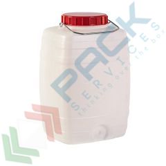 Fustino a bocca larga in plastica (HDPE) con rubinetto, tappo a vite, rubinetto e sfiato sul tappo, sezione quadrata, capacità 25 Lt. Bottiglione in polietilene alta densità idoneo al contatto con gli alimenti, 2 maniglie laterali in plastica per il sollevamento, Mis. 300 L x 270 P x 450 H mm, , Ø bocca 122 mm. Bottiglione in plastica ideale per contenere liquidi, granuli o polveri, dotato di imboccatura larga per facilitare il riempimento e lo svuotamento. Il bottiglione collo largo garantisce una facile operazione di riempimento sia con sostanze liquide che con polveri. La maniglia centrale di cui è dotato inoltre facilita notevolmente le operazioni di sollevamento. Colore neutro. I fustini in plastica NON sono sovrapponibili.