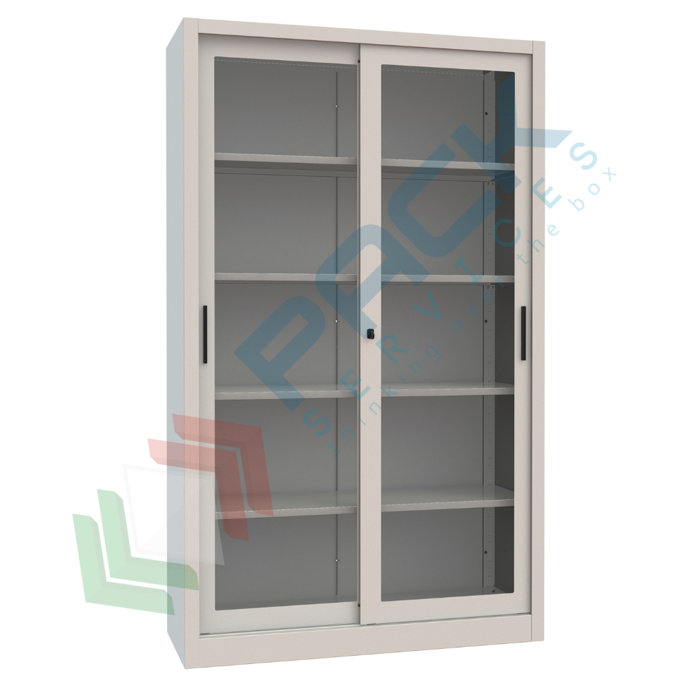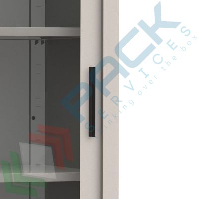 Armadio metallico con ante scorrevoli in cristallo temperato su cuscinetti inferiori e superiori con pieghe antitaglio su quattro ordini e rinforzo centrale, Mis. 1200 L x 450 P x 2000 H mm, maniglia in materiale plastico colore nero. Armadio di metallo con serratura a pulsante con doppia chiave antitrauma in dotazione. Allestimento interno con 4 ripiani mobili su cremagliera, completi di reggimensole in acciaio zincato con predisposizione per alloggiamento cartelle sospese. Vernice a polvere epossipoliestere colore RAL 7035.
