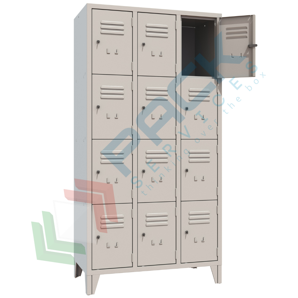 Armadio metallico casellario su piedini in acciaio, Mis. 907 L x 500 P x 1800 H mm, 12 vani. Armadio casellario con ante dotate di cerniere interne con perno di rotazione esterno a 180 °, canottatura di rinforzo sul lato cerniere e pieghe antitaglio su tre ordini sui lati rimanenti, feritoie di aerazione superiori ed inferiori, portacartellino stampato. Armadio in metallo formato da pannellatura unica tra tetto e schiena unito tramite microgiunzione, a creare asole per l'aerazione e fianchi spessore frontale 30 mm con bordi antitaglio piegati su tre ordini. Vernice a polvere epossipoliestere colore RAL 7035. Sistema di chiusura tramite maniglia in metallo lucchettabile a frizione con sistema anti effrazione.