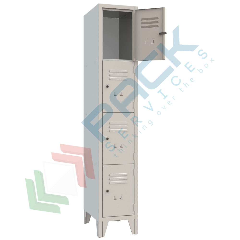 Armadio metallico casellario su piedini in acciaio, Mis. 322 L x 500 P x 1800 H mm, 4 vani. Armadio casellario con ante dotate di cerniere interne con perno di rotazione esterno a 180 °, canottatura di rinforzo sul lato cerniere e pieghe antitaglio su tre ordini sui lati rimanenti, feritoie di aerazione superiori ed inferiori, portacartellino stampato. Armadio in metallo formato da pannellatura unica tra tetto e schiena unito tramite microgiunzione, a creare asole per l'aerazione e fianchi spessore frontale 30 mm.con bordi antitaglio piegati su tre ordini. Vernice a polvere epossipoliestere colore RAL 7035. Sistema di chiusura tramite serratura a cilindro con chiave.