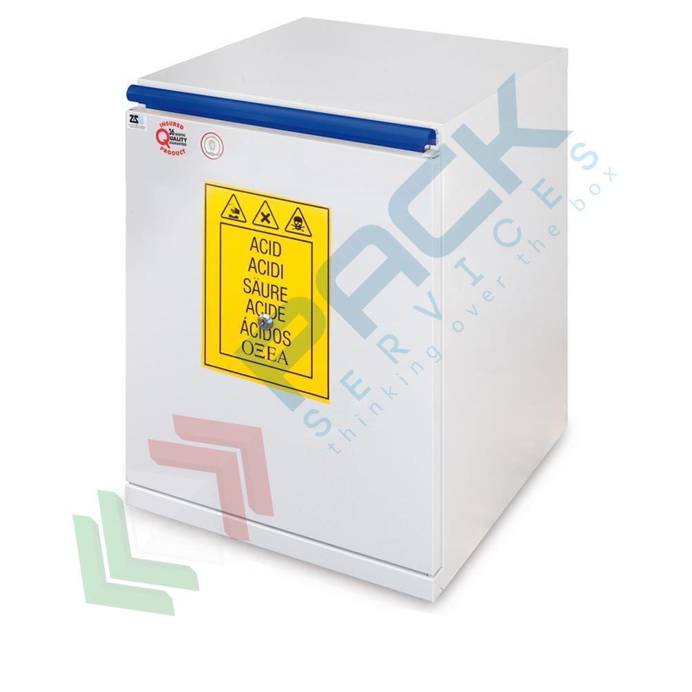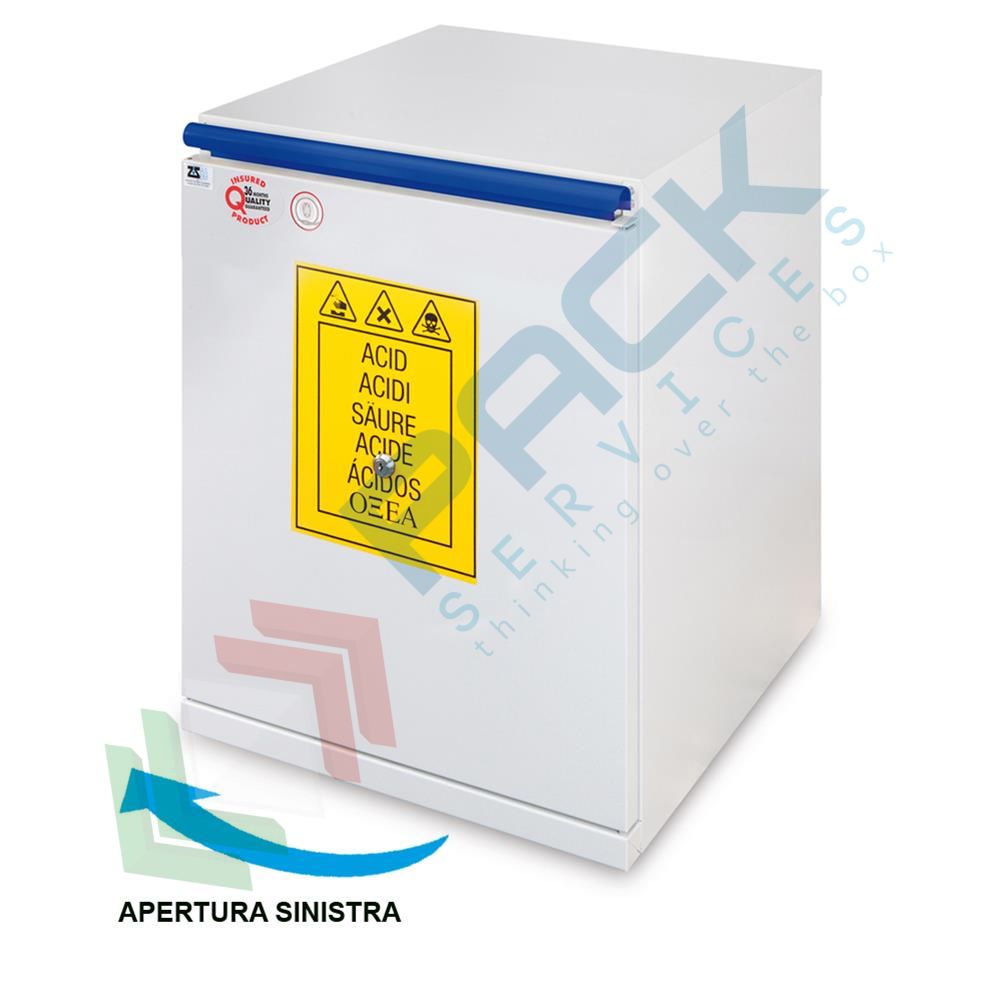 Armadio di sicurezza combinato ideale per stoccaggio di prodotti chimici e acidi, Mis. esterne 395 L x 520 P x 620 H mm, Mis. interne 330 L x 430 P x 530 H mm, capacità 9 bottiglie da 1 Lt, peso 51 Kg. Armadio per prodotti chimici realizzato in lamiera di acciaio con vernice antiacido, spessore della lamiera 1; 1,5; 2 mm con processo di pressopiegatura a freddo. Le finiture interne sono realizzate in laminato melaminico con alta resistenza ai vapori aggressivi. Pannelli agglomerato idrofugo. La struttura esterna è smontabile e verniciata con polveri epossidiche antiacido con passaggio in galleria termica a 200 °C. Regolazione di messa a livello per mezzo di piedini regolabili con chiave. Certificazione secondo la nuova norma EN 14727 ed EN 61010. Serratura con chiave e blocco delle porte, morsetto di terra per prevenire cariche elettrostatiche. Colore grigio RAL 7035. Apertura a sinistra.