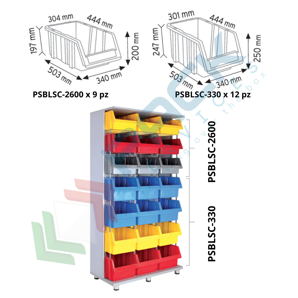 Armadio portaminuteria fornito completo di 21 cassette in plastica bocca di lupo modello sovrapponibile e componibile con Mis. esterne 1070 L x 510 P x 2000 H mm. L'armadio per cassette ha piedi alla base e ha una struttura in metallo e legno. L'armadio è completo di 9 cassette 26 Lt Mis. 340 L x 503 P x 200 H mm (Cod. Art. PSBLSC-2600) + 12 cassette 33 Lt Mis. 340 L x 503 P x 250 H mm (Cod. Art. PSBLSC-3300). Le cassette bocca di lupo sono ideali per lo stoccaggio di piccoli componenti; Rappresentano infatti la soluzione ideale per tutte le esigenze di magazzinaggio per ferramenta, officine e magazzino come portaminuteria. Il lato frontale aperto del contenitore portaminuteria rende facilmente accessibili i componenti al suo interno. Le cassette bocca di lupo presenti nell'armadio sono componibili e sono collegate tra di loro tramite i perni (Cod. PSSBL-GN) applicati sui 4 lati della cassetta. Fornito già montato.