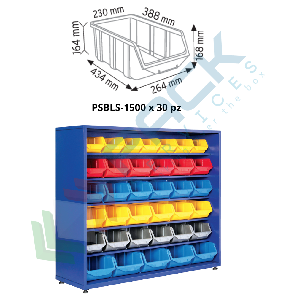Armadio portaminuteria fornito completo di 30 cassette in plastica bocca di lupo modello sovrapponibile con Mis. esterne 1400 L x 450 P x 1200 H mm. L'armadio per cassette ha piedini alla base e ha una struttura in metallo e legno. L'armadio è completo di 30 cassette 15 Lt Mis. 264 L x 434 P x 168 H mm (Cod. Art. PSBLS-1500). Le cassette bocca di lupo sono ideali per lo stoccaggio di piccoli componenti; Rappresentano infatti la soluzione ideale per tutte le esigenze di magazzinaggio per ferramenta, officine e magazzino come portaminuteria. Il lato frontale aperto del contenitore portaminuteria rende facilmente accessibili i componenti al suo interno. Fornito già montato..