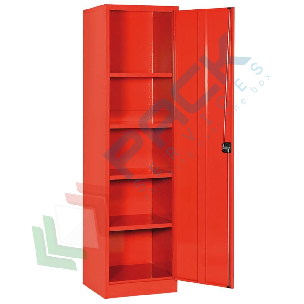 Armadio porta DPI in metallo, per il contenimento di dispositivi di protezione individuale (DPI). Armadio contenitore DPI in metallo, 1 anta cieca, 4 ripiani, piedini regolabili, mis. 580 L x 460 P x 1800 H mm, 40 Kg, serratura in alluminio e PVC a doppia chiave. Armadio per contenimento DPI per contenimento dispositivi di protezione individuale realizzato in lamiera di acciaio al carbonio P02 spessore 8/10, pre-trattato con fosfosgrassaggio in tunnel alte temperature, verniciatura in epossipoliestere colore rosso RAL 3000 cottura in galleria termica 180°. Armadio di sicurezza per DPI dotato di ripiani regolabili in altezza e adesivi D.P.I. come da normativa.