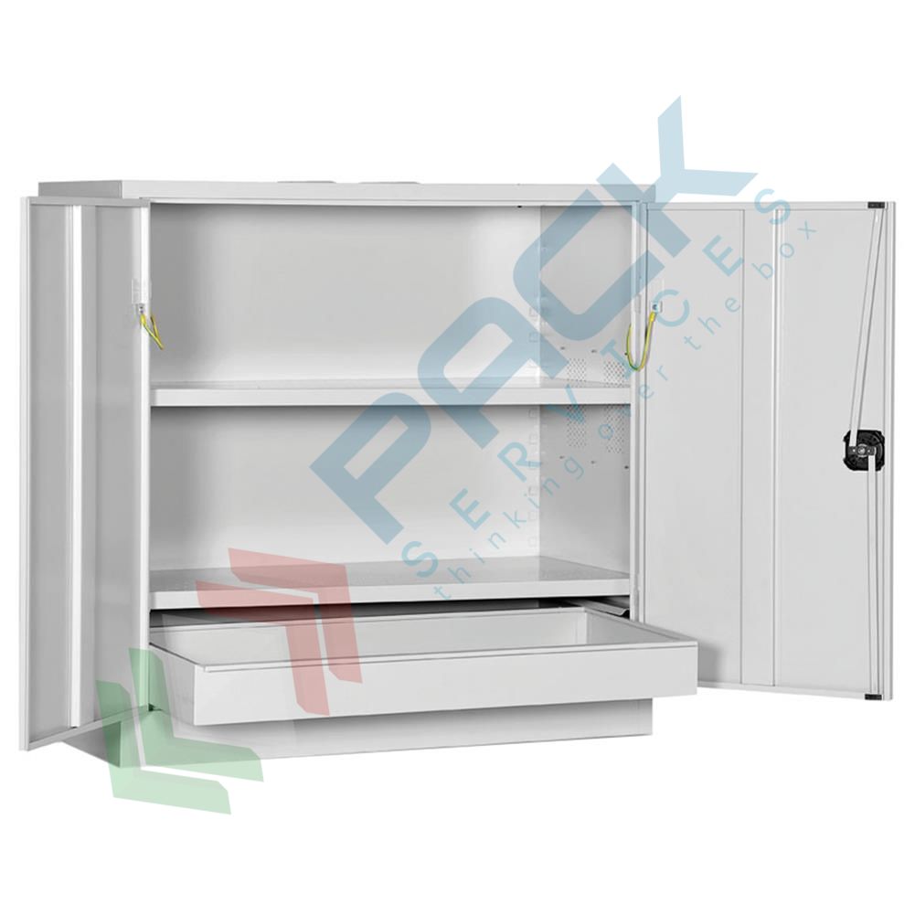 Armadio di sicurezza realizzato in lamiera di acciaio spessore 8/10 per sostanze chimiche, acide e corrosive, Mis. 1000 L x 460 P x 1000 H mm. Armadio idoneo per lo stoccaggio di sostanze pericolose o nocive conforme alle norme attualmente in vigore per igiene e sicurezza sul lavoro e tutela dell’ambiente, etichetta di segnaletica come da D.Lgs.81/08, predisposizione per la messa a terra. Armadio dotato di 4 piedini regolabili fino a 6 cm, 2 ante battenti cieche rinforzate e serratura con aste e maniglia, 2 piani mobili zincati forati per lo sgocciolamento. Vasca di raccolta estraibile sul fondo con capacità 35 Lt, feritoie d’aerazione con griglie frangifiamma nei fianchi e sul cielo.