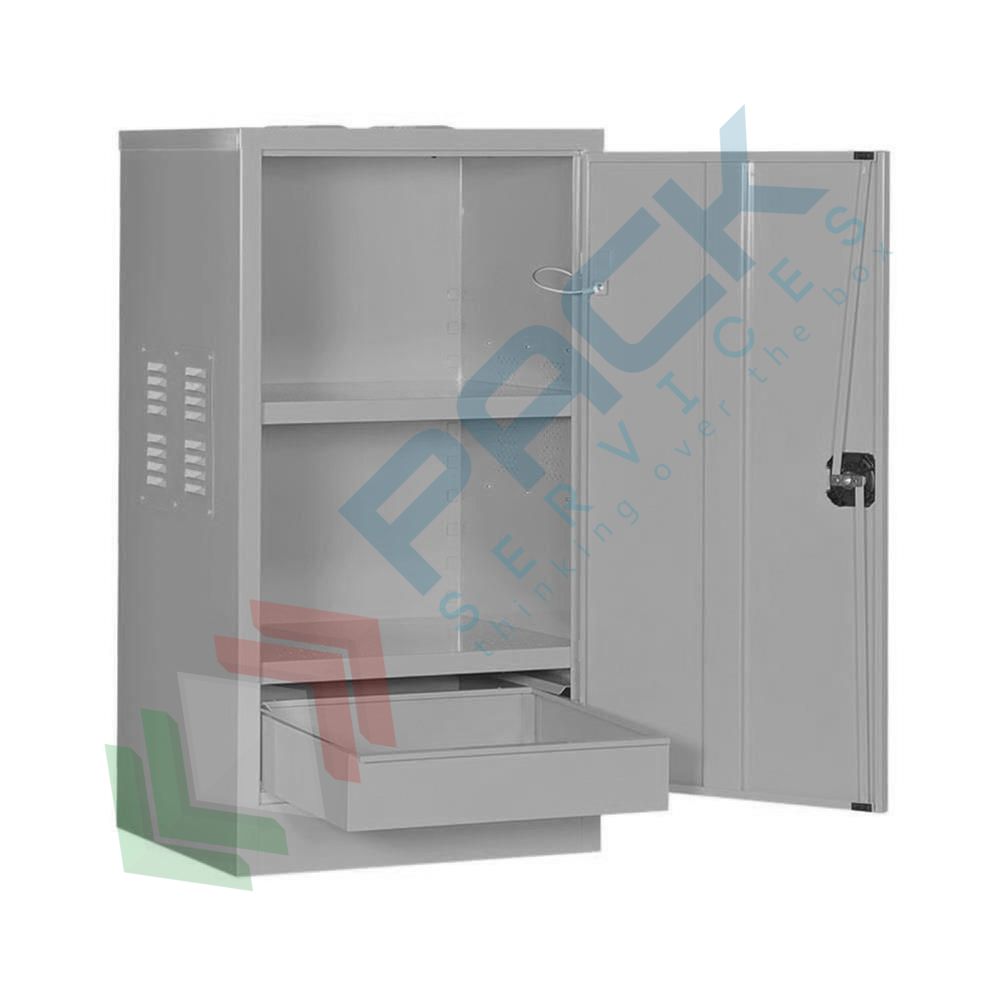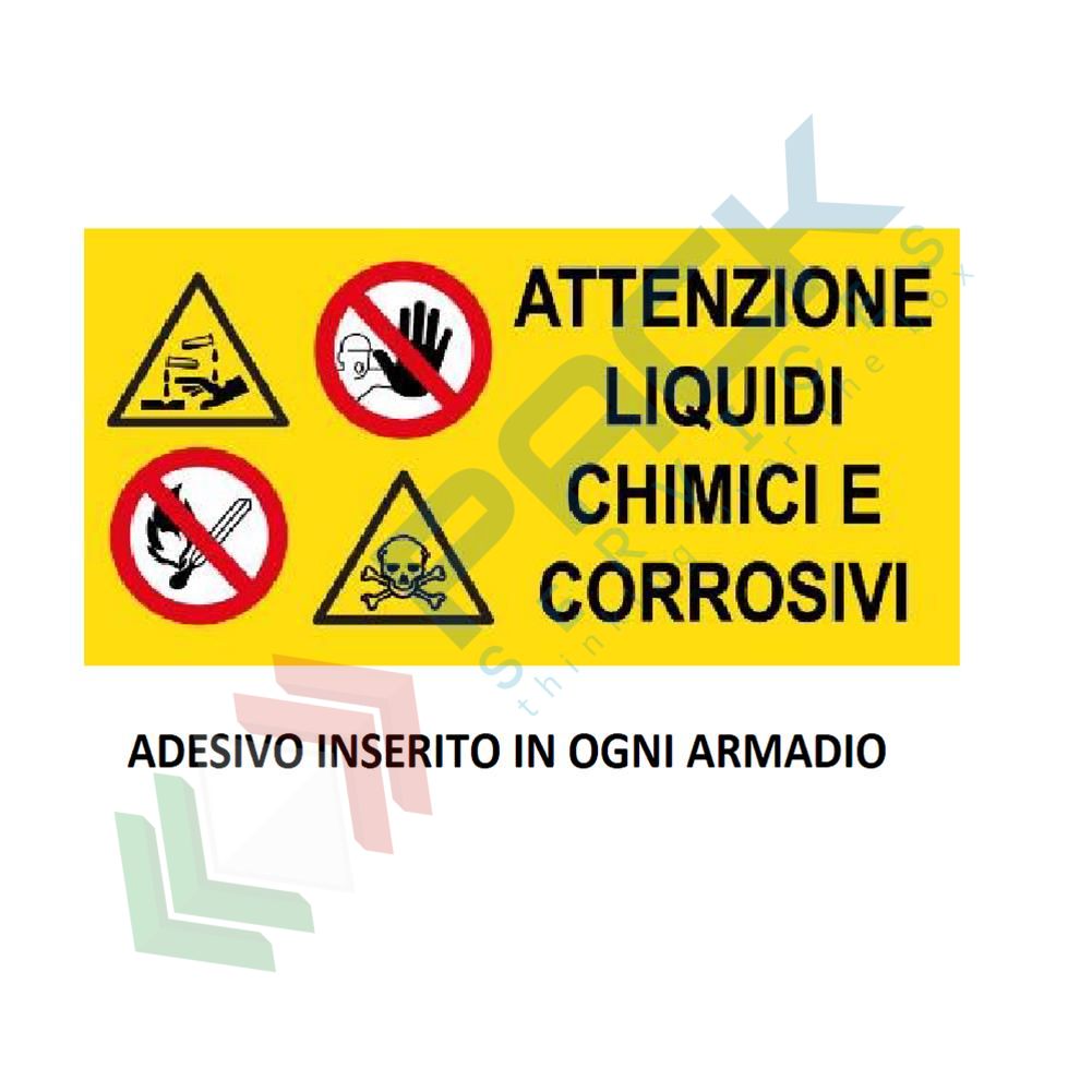 Armadio di sicurezza realizzato in lamiera di acciaio spessore 8/10 per sostanze chimiche, acide e corrosive. Armadio idoneo per lo stoccaggio di sostanze pericolose o nocive conforme alle norme attualmente in vigore per igiene e sicurezza sul lavoro e tutela dell’ambiente, etichetta di segnaletica come da D.Lgs.81/08, predisposizione per la messa a terra. Mis. 580 L x 460 P x 1000 H mm. Armadio dotato di 4 piedini regolabili fino a 6 cm. 1 Anta battente cieca rinforzata e serratura con aste e maniglia, 2 piani zincati mobili forati per lo sgocciolamento, vasca di raccolta estraibile sul fondo con capacità 20 Lt, feritoie d’aerazione con griglie frangifiamma nei fianchi e sul cielo.