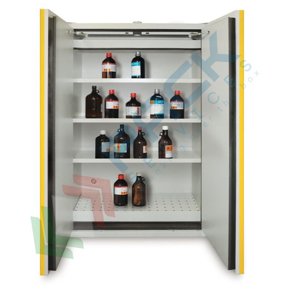 Armadio di sicurezza per lo stoccaggio di prodotti infiammabili realizzato in lamiera di acciaio elettrogalvanizzata dello spessore di 1 - 1,5 mm, piegata a freddo, Mis. esterna 1200 L x 600 P x 2050 H mm, Mis. interna 1095 L x 446 P x 1540 H mm, chiusura automatica delle ante quando la temperatura ambiente supera i 50 °C. L'armadio di sicurezza per infiammabili è certificato secondo le norme EN14470-1 e EN16121, garantisce resistenza al fuoco certificata 90 min. Armadio con 3 ripiani in acciaio verniciato (carico max 80 Kg distribuiti uniformemente) + 1 vasca con griglia (capacità 45 litri), capacità di stoccaggio 160/200 bottiglie da 1 Litro per armadio, 2 ante ad incavo. Colore grigio. L'armadio è adatto per interni, non è pensato per essere collocato all'esterno. Posti esternamente a contatto con gli agenti atmosferici, gli armadi per infiammabili perderebbero le loro caratteristiche di resistenza al fuoco.