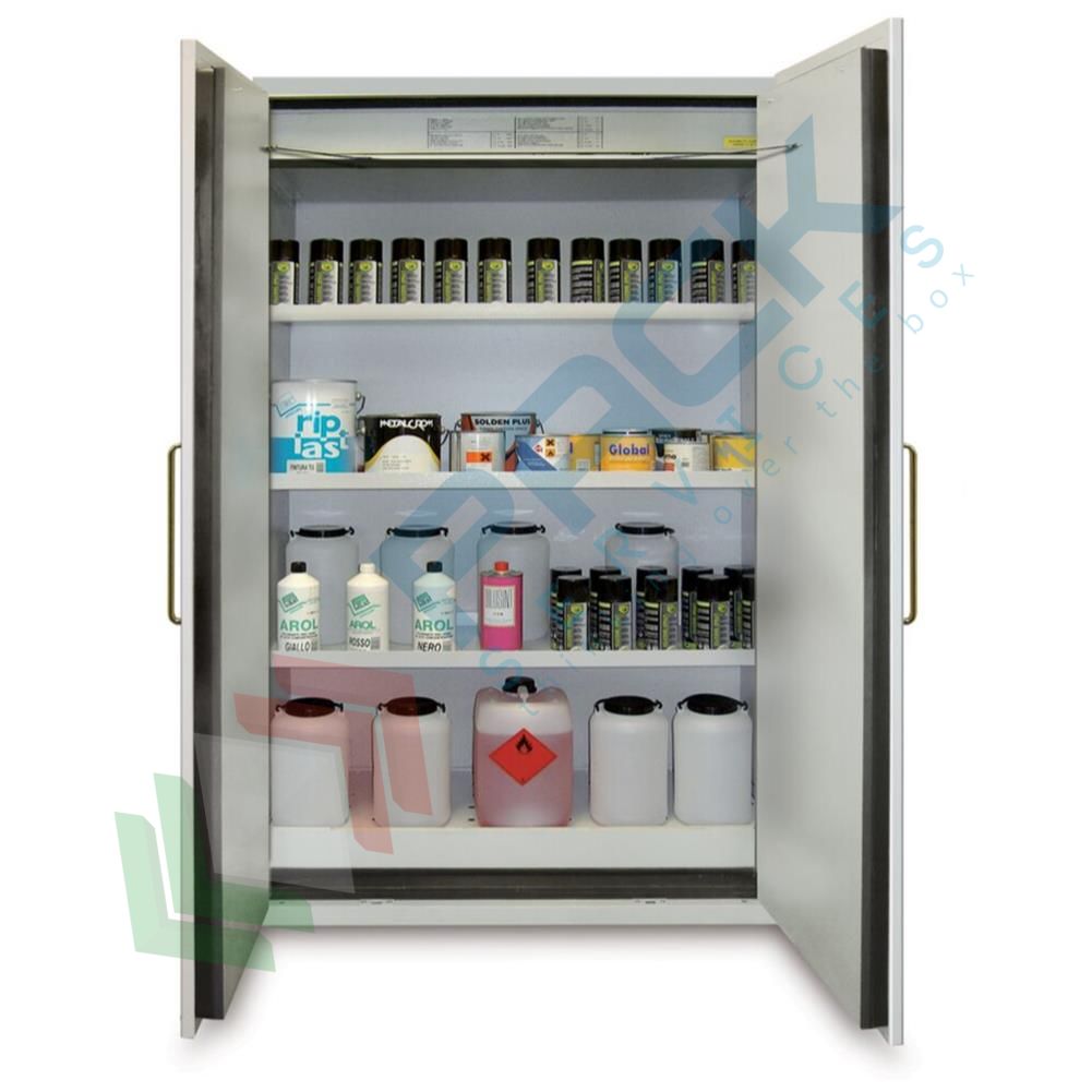 Armadio di sicurezza per lo stoccaggio di prodotti infiammabili realizzato in lamiera di acciaio elettrogalvanizzata dello spessore di 1 - 1,5 mm, piegata a freddo, Mis. esterna 1200 L x 600 P x 1950 H mm, Mis. interna 1095 L x 446 P x 1540 H mm, chiusura automatica delle ante quando la temperatura ambiente supera i 50 °C. L'armadio di sicurezza per infiammabili è certificato secondo le norme EN14470-1 e EN16121, garantisce resistenza al fuoco certificata 90 min. Armadio con 3 ripiani in acciaio verniciato (carico max 80 Kg distribuiti uniformemente) + 1 vasca con griglia (capacità 45 litri), capacità di stoccaggio 160/200 bottiglie da 1 Litro per armadio, 2 ante con maniglia. Colore grigio. L'armadio è adatto per interni, non è pensato per essere collocato all'esterno. Posti esternamente a contatto con gli agenti atmosferici, gli armadi per infiammabili perderebbero le loro caratteristiche di resistenza al fuoco.