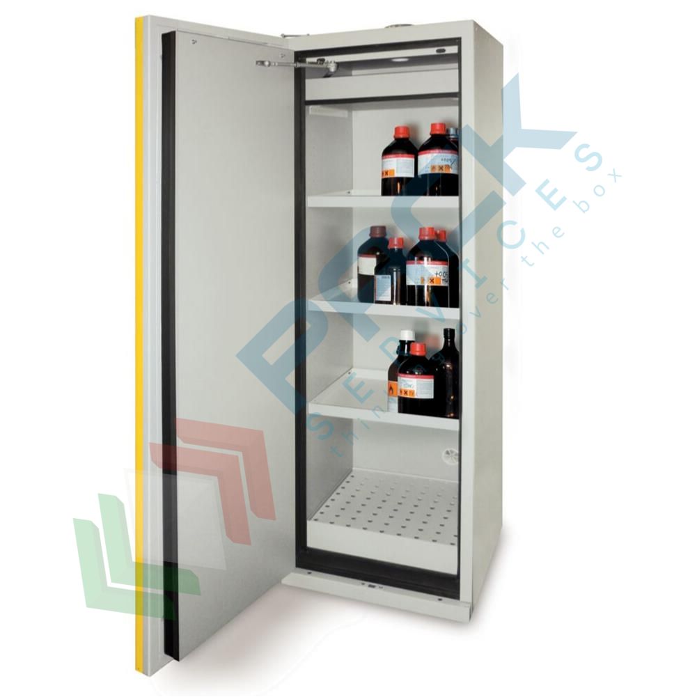 Armadio di sicurezza per infiammabili Type 90, Mis. 595 L x 600 P x 2050 H mm, ripiani in acciaio inox, anta ad incavo apertura SX, colore grigio