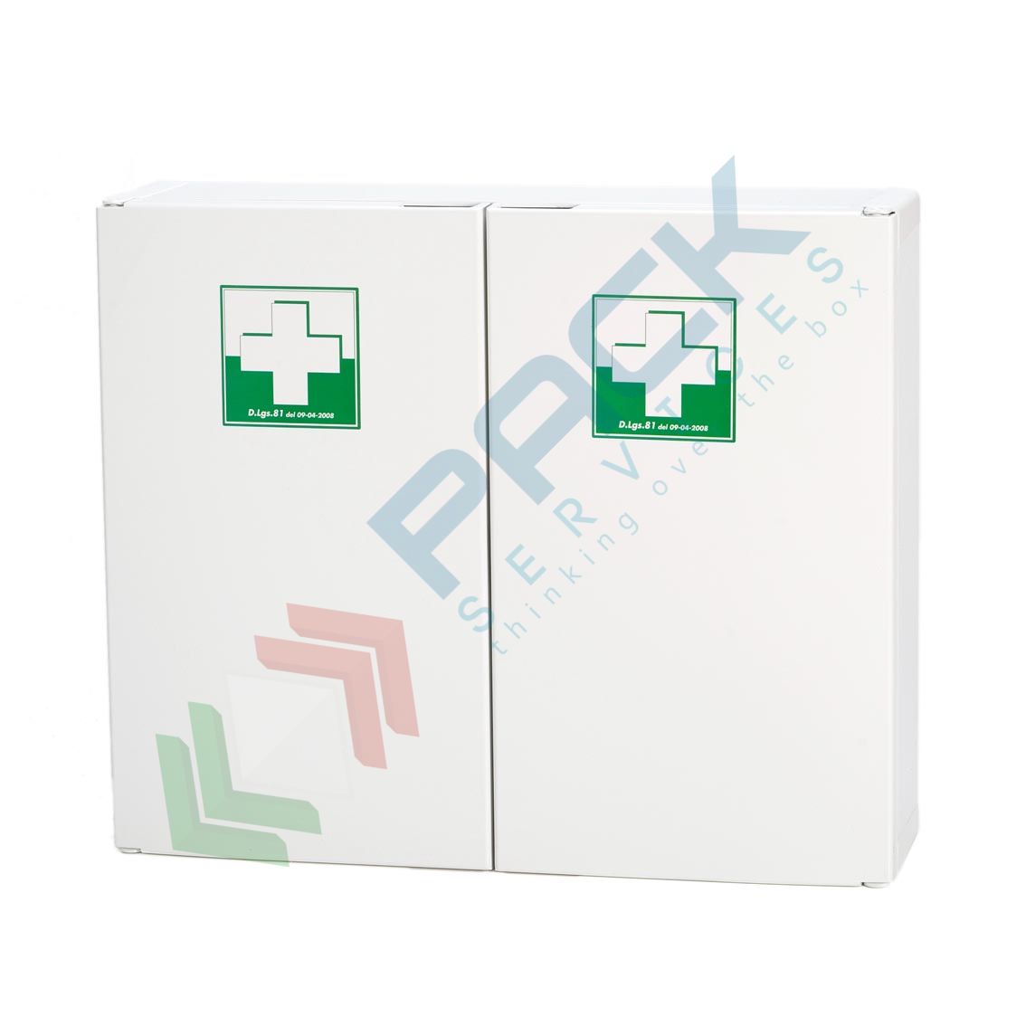 Armadio pronto soccorso in plastica completo del contenuto previsto dall'allegato 3 Dpp 13.06.05 (contenuto allegato 1 e integrazione per aziende del Trentino Alto Adige), obbligatorio quindi per aziende o unità produttive del gruppo A e B con più di 3 lavoratori situate nella provincia di Bolzano. Armadietto pronto soccorso realizzato in polipropilene a due ante, 2 ripiani interni, 4 vani, chiusura a scatto, misura 37 x 45 x 13 cm. L'armadio primo soccorso prevede un contenuto base, ovvero tutti i prodotti necessari in caso di emergenza come cerotti, guanti, garze, termometro, forbici e molto altro.