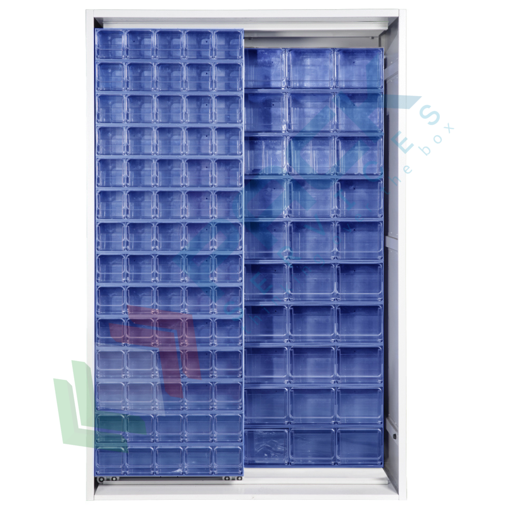 Armadio porta minuteria realizzato in lamiera elettrosaldata con barre di rinforzo, verniciata a forno in polvere epossidica di colore grigio, Mis. 1270 L x 400 P x 1950 H mm, capacità 210 cassetti. La struttura dell' armadio con cassettiere prevede due pannelli fissi affiancati sul fondo + un pannello scorrevole su cuscinetti a sfera; I due pannelli fissi contengono 14+14 cassettiere Cod. Art. CRBOX-5B, il pannello scorrevole contiene 14 cassettiere Cod. Art. CRBOX-5B. Capacità di carico pari circa a 160 Kg per singolo pannello. Colore struttura grigio chiaro RAL 7035, cassettiere colore blu simile RAL 5017.
