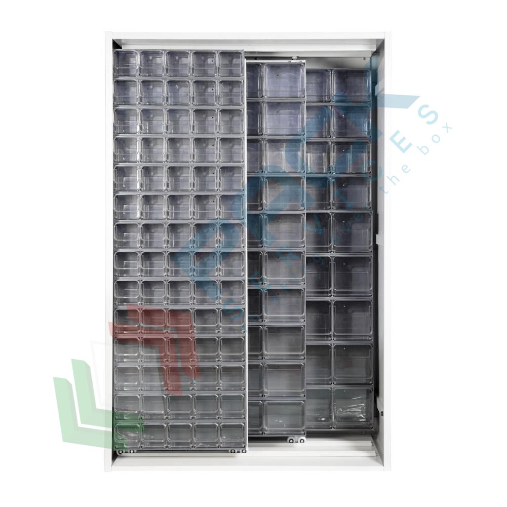 Armadio porta minuteria realizzato in lamiera elettrosaldata con barre di rinforzo, verniciata a forno in polvere epossidica di colore grigio, Mis. 1270 L x 600 P x 1950 H mm, capacità 200 cassetti. La struttura dell' armadio con cassettiere prevede due pannelli fissi affiancati sul fondo + due pannelli scorrevoli su cuscinetti a sfera; I due pannelli fissi contengono 10 cassettiere Cod. Art. CRBOX-3S + 10 cassettiere Cod. Art. CRBOX-3S, il pannello scorrevole posteriore contiene 14 cassettiere Cod. Art. CRBOX-5S, invece, il pannello scorrevole anteriore contiene 14 cassettiere Cod. Art. CRBOX-5S. Capacità di carico pari circa a 160 Kg per singolo pannello. Colore struttura grigio chiaro RAL 7035, cassettiere colore grigio scuro simile RAL 7016.