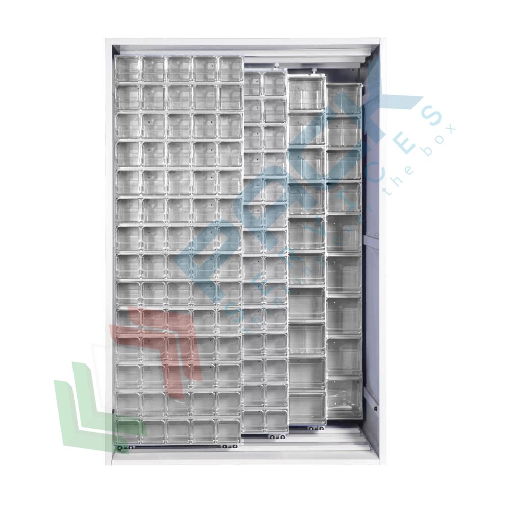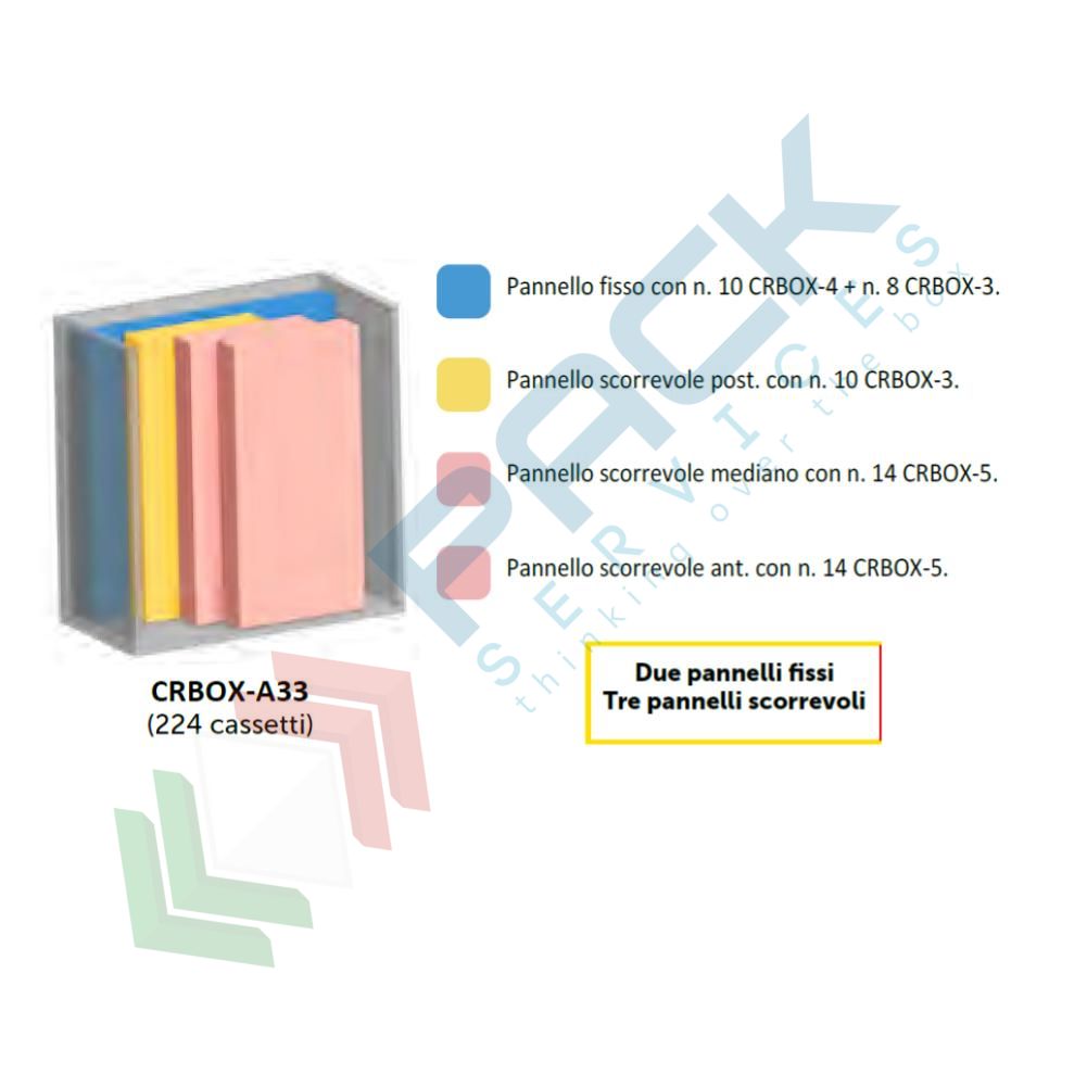 Armadio porta minuteria realizzato in lamiera elettrosaldata con barre di rinforzo, verniciata a forno in polvere epossidica di colore grigio, Mis. 1270 L x 800 P x 1950 H mm, capacità 224 cassetti. La struttura dell' armadio con cassettiere prevede due pannelli fissi affiancati sul fondo + due pannelli scorrevoli su cuscinetti a sfera; I due pannelli fissi contengono 10 cassettiere Cod. Art. CRBOX-4G + 8 cassettiere Cod. Art. CRBOX-3G, il pannello scorrevole posteriore contiene 10 cassettiere Cod. Art. CRBOX-3G, il pannello scorrevole mediano contiene 14 cassettiere Cod. Art.CRBOX-5G, il pannello scorrevole anteriore contiene, infine, 14 cassettiere Cod. Art. CRBOX-5G. Capacità di carico pari circa a 160 Kg per singolo pannello. Colore struttura grigio chiaro RAL 7035, cassettiere colore grigio simile RAL 7035.