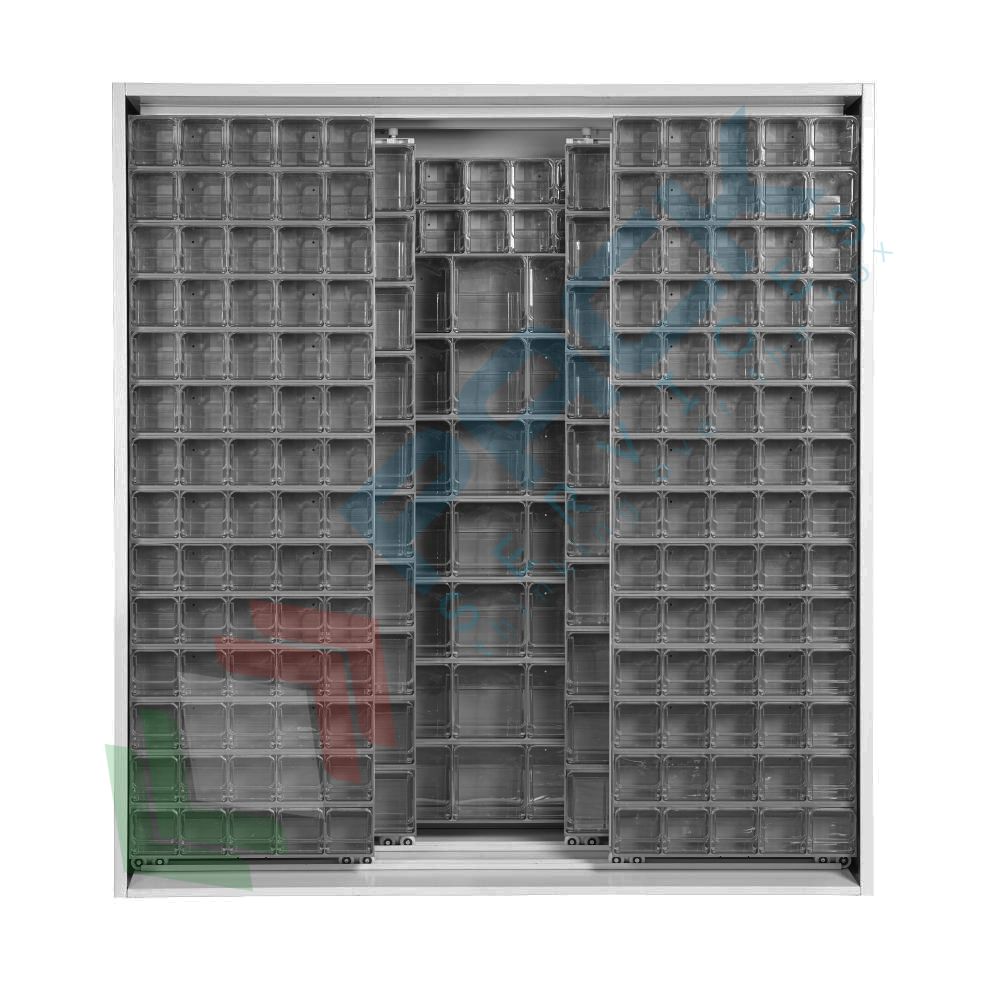 Armadio porta minuteria realizzato in lamiera elettrosaldata con barre di rinforzo, verniciata a forno in polvere epossidica di colore grigio, Mis. 1870 L x 600 P x 1950 H mm, capacità 210 cassetti. La struttura dell' armadio con cassettiere prevede tre pannelli fissi affiancati sul fondo + quattro pannelli scorrevoli su cuscinetti a sfera.; I tre pannelli fissi contengono 10 + 10 + 10 cassettiere Cod. Art. CRBOX-3S, il pannello scorrevole posteriore contiene 10 + 10 cassettiere CRBOX-3S, il pannello scorrevole anteriore, invece, contiene 10 + 10 cassettiere Cod. Art. CRBOX-3S. I tre pannelli fissi sono affiancati posizionati sul fondo, mentre i quattro pannelli scorrevoli montano su dei cuscinetti scorrevoli in nylon. Capacità di carico pari circa a 160 Kg per singolo pannello. Colore struttura grigio chiaro RAL 7035, cassettiere colore grigio simile simile RAL 7016.
