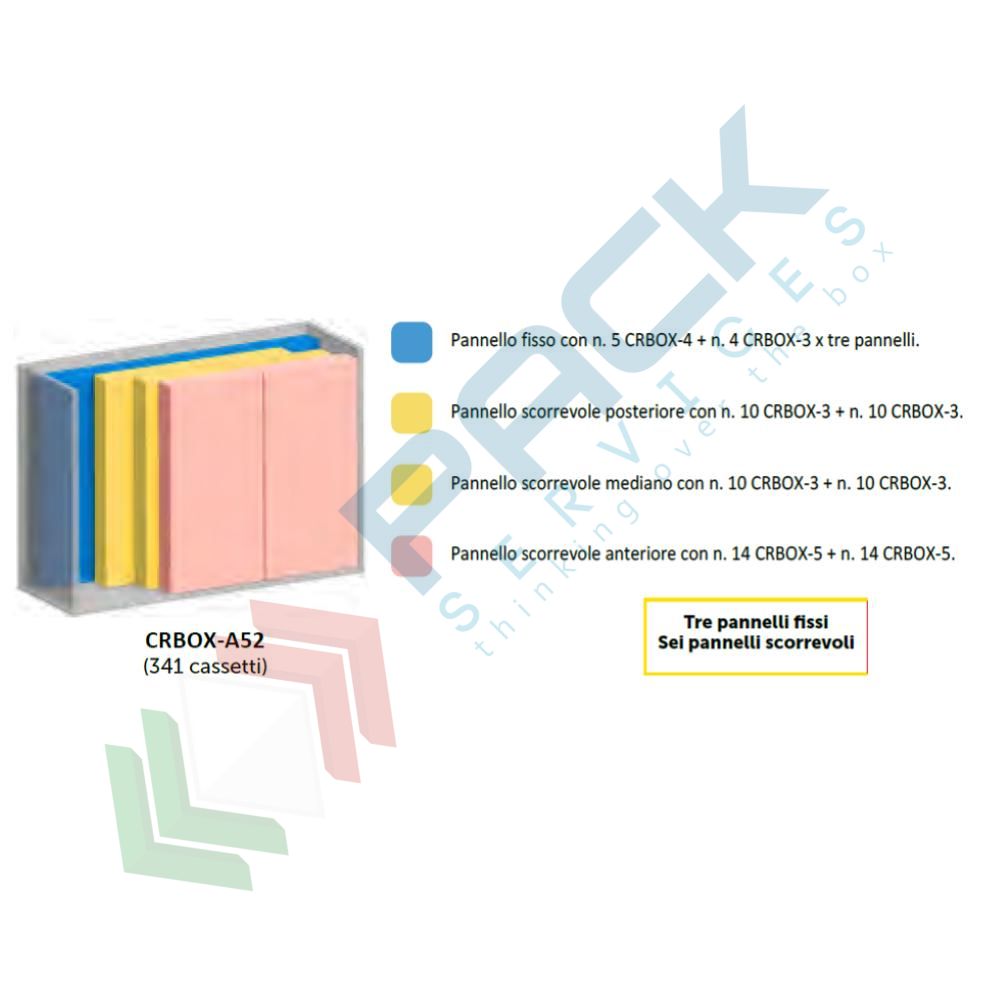 Armadio porta minuteria realizzato in lamiera elettrosaldata con barre di rinforzo, verniciata a forno in polvere epossidica di colore grigio, Mis. 1870 L x 800 P x 1950 H mm, capacità 341 cassetti. La struttura prevede tre pannelli fissi affiancati sul fondo + sei pannelli scorrevoli su cuscinetti a sfera; I tre pannelli fissi contengono 5 cassettiere Cod. Art. CRBOX-4B + 4 cassettiere Cod. Art. CRBOX-3B (x 3 pannelli), il pannello scorrevole posteriore contiene 10 + 10 cassettiere Cod. Art. CRBOX-3B, il pannello scorrevole mediano contiene 10 + 10 cassettiere Cod. Art. CRBOX-3B, il pannello scorrevole anteriore, invece, contiene 14 + 14 cassettiere Cod. Art. CRBOX-5B. I tre pannelli fissi sono affiancati posizionati sul fondo, mentre i sei pannelli scorrevoli montano su dei cuscinetti scorrevoli in nylon. Capacità di carico pari circa a 160 Kg per singolo pannello. Colore struttura grigio chiaro RAL 7035, cassettiere colore blu simile RAL 5017.