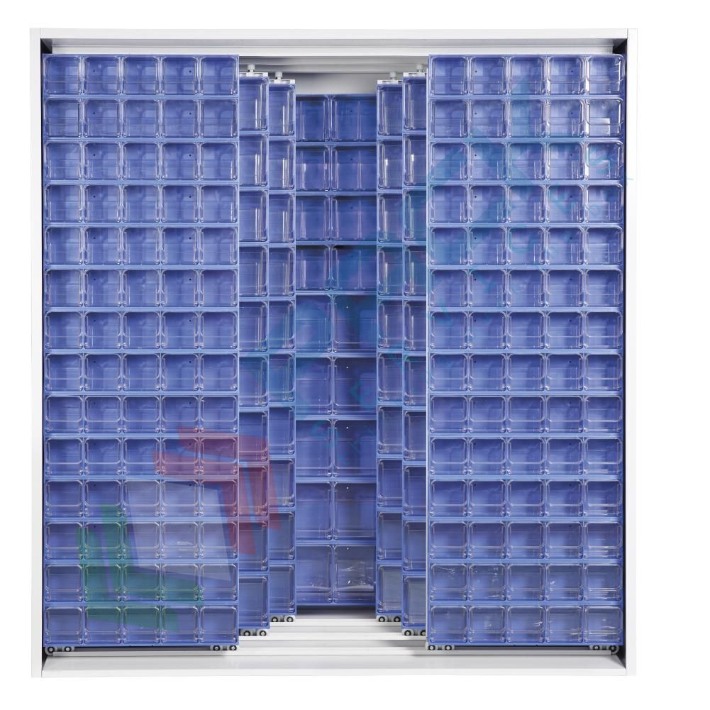 Armadio con cassettiere porta minuteria, capacità 341 cassetti, 3 pannelli fissi + 6 scorrevoli, colore blu