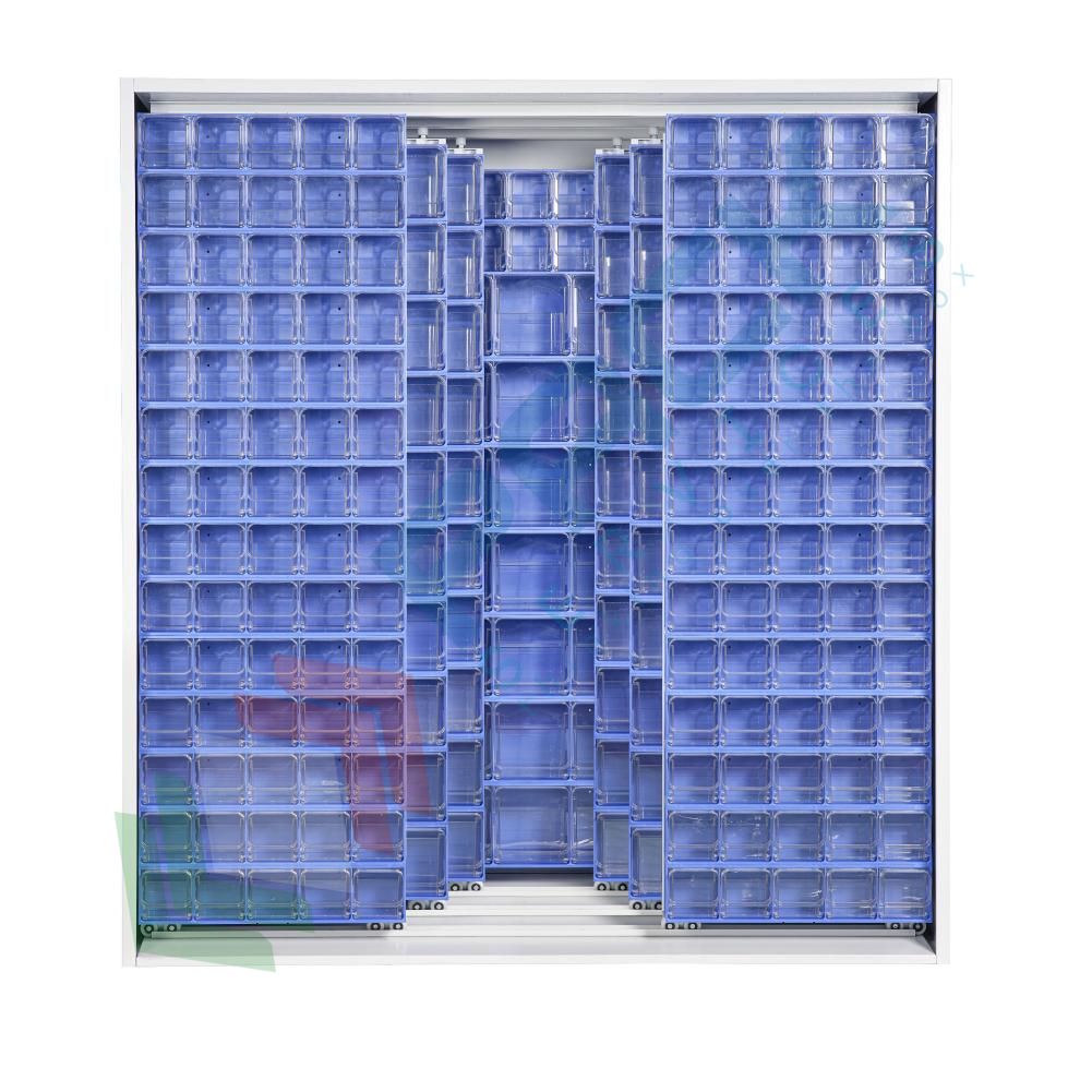 Armadio porta minuteria realizzato in lamiera elettrosaldata con barre di rinforzo, verniciata a forno in polvere epossidica di colore grigio, Mis. 1870 L x 800 P x 1950 H mm, capacità 421 cassetti. La struttura prevede tre pannelli fissi affiancati sul fondo + sei pannelli scorrevoli su cuscinetti a sfera; I tre pannelli fissi contengono 5 cassettiere Cod. Art. CRBOX-4B + 4 cassettiere Cod. Art. CRBOX-3B (x 3 pannelli), il pannello scorrevole posteriore contiene 10 + 10 cassettiere Cod. Art. CRBOX-3B, il pannello scorrevole mediano contiene 14 + 14 cassettiere Cod. Art. CRBOX-5B, il pannello scorrevole anteriore, invece, contiene 14 + 14 cassettiere Cod. Art. CRBOX-5B. I tre pannelli fissi sono affiancati posizionati sul fondo, mentre i sei pannelli scorrevoli montano su dei cuscinetti scorrevoli in nylon. Capacità di carico pari circa a 160 Kg per singolo pannello. Colore struttura grigio chiaro RAL 7035, cassettiere colore blu simile RAL 5017.