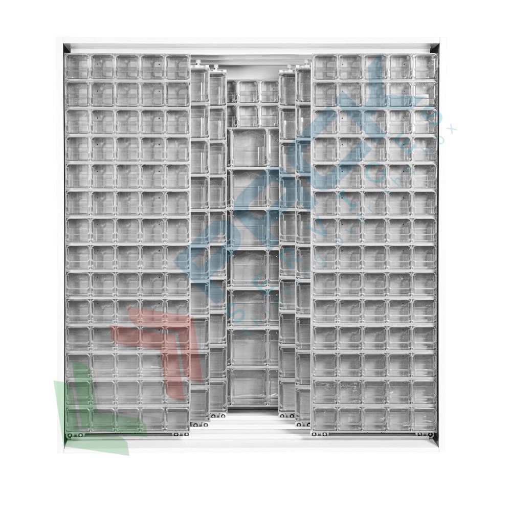 Armadio porta minuteria realizzato in lamiera elettrosaldata con barre di rinforzo, verniciata a forno in polvere epossidica di colore grigio, Mis. 1870 L x 800 P x 1950 H mm, capacità 510 cassetti. La struttura prevede tre pannelli fissi affiancati sul fondo + sei pannelli scorrevoli su cuscinetti a sfera; I tre pannelli fissi contengono 10 cassettiere Cod. Art. CRBOX-3G (x 3 pannelli), il pannello scorrevole posteriore contiene 14 + 14 cassettiere Cod. Art. CRBOX-5G, il pannello scorrevole mediano contiene 14 + 14 cassettiere Cod. Art. CRBOX-5G, il pannello scorrevole anteriore, invece, contiene 14 + 14 cassettiere Cod. Art. CRBOX-5G. I tre pannelli fissi sono affiancati posizionati sul fondo, mentre i sei pannelli scorrevoli montano su dei cuscinetti scorrevoli in nylon. Capacità di carico pari circa a 160 Kg per singolo pannello. Colore struttura grigio chiaro RAL 7035, cassettiere colore grigio simile RAL 7035.