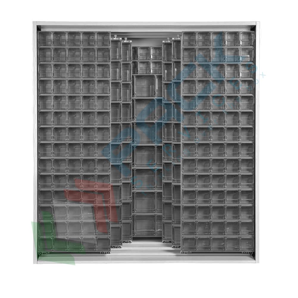 Armadio porta minuteria realizzato in lamiera elettrosaldata con barre di rinforzo, verniciata a forno in polvere epossidica di colore grigio, Mis. 1870 L x 800 P x 1950 H mm, capacità 510 cassetti. La struttura prevede tre pannelli fissi affiancati sul fondo + sei pannelli scorrevoli su cuscinetti a sfera; I tre pannelli fissi contengono 10 cassettiere Cod. Art. CRBOX-3S (x 3 pannelli), il pannello scorrevole posteriore contiene 14 + 14 cassettiere Cod. Art. CRBOX-5S, il pannello scorrevole mediano contiene 14 + 14 cassettiere Cod. Art. CRBOX-5S, il pannello scorrevole anteriore, invece, contiene 14 + 14 cassettiere Cod. Art. CRBOX-5S. I tre pannelli fissi sono affiancati posizionati sul fondo, mentre i sei pannelli scorrevoli montano su dei cuscinetti scorrevoli in nylon. Capacità di carico pari circa a 160 Kg per singolo pannello. Colore struttura grigio chiaro RAL 7035, cassettiere colore grigio simile RAL 7016.