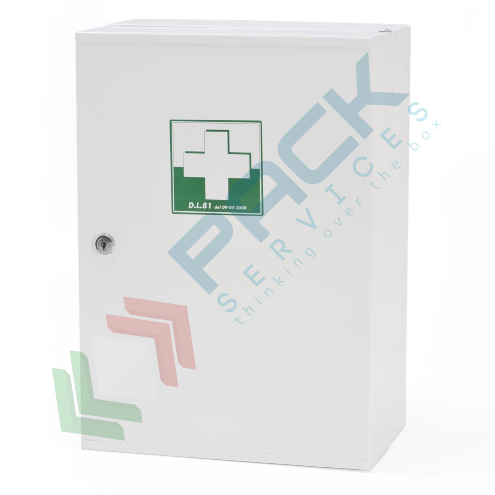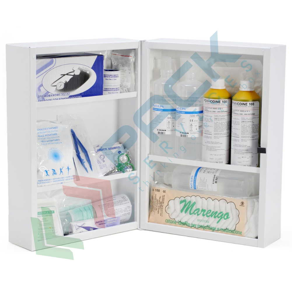Armadio pronto soccorso in metallo completo del contenuto previsto dall'allegato 3 Dpp 13.06.05 (contenuto allegato 1 e integrazione per aziende del Trentino Alto Adige), obbligatorio quindi per aziende o unità produttive del gruppo A e B con più di 3 lavoratori situate nella provincia di Bolzano. Armadietto pronto soccorso realizzato in metallo verniciato con polvere epossidica colore bianco, anta portante,3 ripiani , 5 vani, serratura con chiave, misura 320 L x 450 P x 190 H mm. L'armadio primo soccorso prevede un contenuto base, ovvero tutti i prodotti necessari in caso di emergenza come cerotti, guanti, garze, termometro, forbici e molto altro.