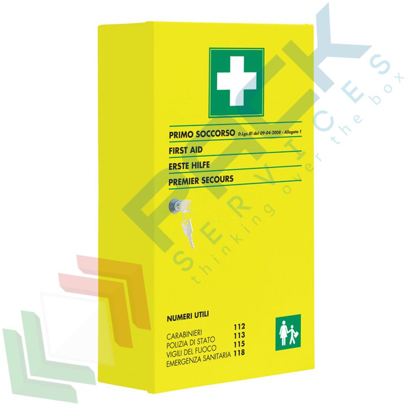 Armadio pronto soccorso in metallo verniciato con polvere epossidica FLUO, completo del contenuto previsto dall'allegato 1 del D.M. 388 del 15 luglio 2003 e D.L. 81 del 09 aprile 2008 art. 45, obbligatorio quindi per aziende o unità produttive del gruppo A e B con più di 3 lavoratori. Armadietto pronto soccorso dispone di due ripiani in acciaio per organizzare i prodotti di pronto soccorso e un'anta dotata di tre scaffali per una maggiore capacità di stoccaggio. Serratura con chiave per garantire la sicurezza e l’accesso controllato ai prodotti di pronto soccorso. Misura 30 x 50 x 12 cm. Il contenuto dell'armadietto primo soccorso prevede un contenuto base, ovvero tutti i prodotti necessari in caso di emergenza come cerotti, guanti, garze, termometro, forbici e molto altro + MAGGIORAZIONE comparto OFFICINE SCUOLA.