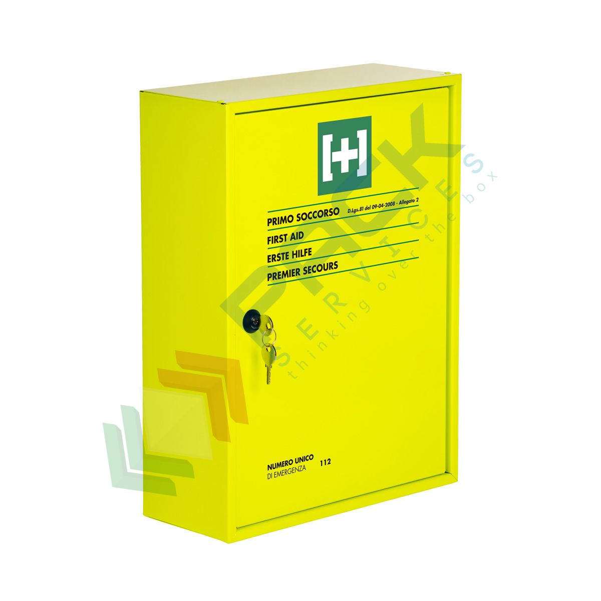 Armadio pronto soccorso in metallo verniciato con polvere epossidica FLUO,completo del contenuto previsto dall'allegato 2 del D.M. 388 del 15 luglio 2003 e D.L. 81 del 09 aprile 2008 art. 45, obbligatorio quindi per aziende o unità produttive del gruppo C con meno di tre lavoratori. L’art.2 punto 5 del DM 388 del 15.7.2003 prevede che il contenuto dell’allegato 2 deve essere fornito anche ai lavoratori che operano in luoghi diversi dalla sede aziendale o unità produttiva. Armadietto pronto soccorso dispone di un ripiano in acciaio per organizzare i prodotti di pronto soccorso e di due vani per una maggiore capacità di stoccaggio. Serratura con chiave per garantire la sicurezza e l’accesso controllato ai prodotti di pronto soccorso. Misura 40 x 30 x 12 cm. Il contenuto dell'armadietto primo soccorso prevede un contenuto base, ovvero tutti i prodotti necessari in caso di emergenza come cerotti, guanti, garze, termometro, forbici e molto altro.
