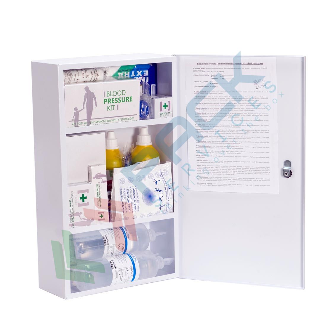 Armadietto pronto soccorso in metallo, contenuto base conforme all'allegato 1 del D.lgs. 81/2008-D.M.388/2003, ideale per 3 o più lavoratori (per aziende del gruppo AB)