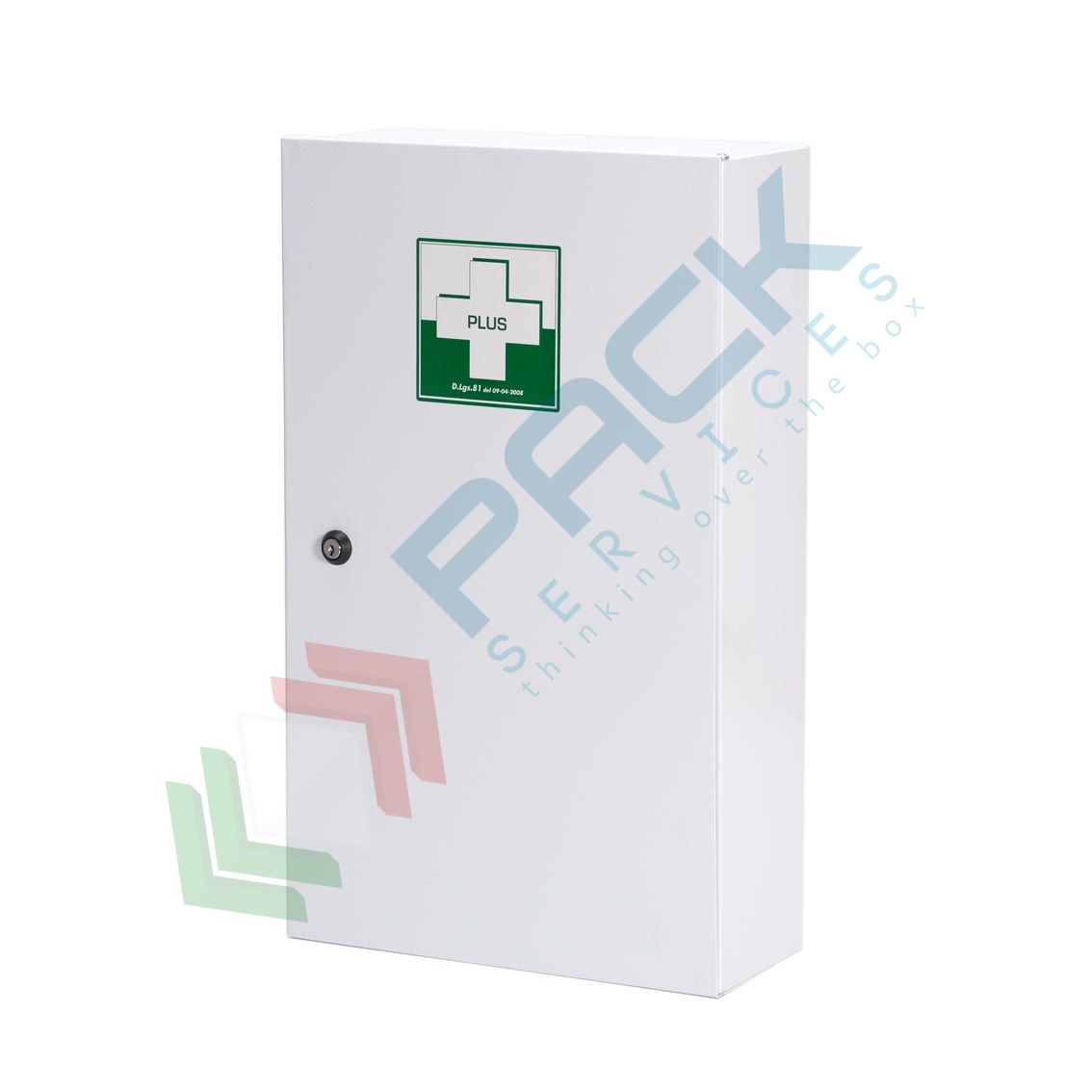 Armadio pronto soccorso in metallo completo del contenuto previsto dall'allegato 1 del D.M. 388 del 15 luglio 2003 e D.L. 81 del 09 aprile 2008 art. 45, obbligatorio quindi per aziende o unità produttive del gruppo A e B con più di 3 lavoratori. Armadietto pronto soccorso Mis. 30 x 50 x 12 cm in metallo verniciato con polvere epossidica, 2 ripiani, 3 vani, con serratura con chiave. Il contenuto dell'armadietto primo soccorso prevede un contenuto base, ovvero tutti i prodotti necessari in caso di emergenza come cerotti, guanti, garze, termometro, forbici e molto altro.