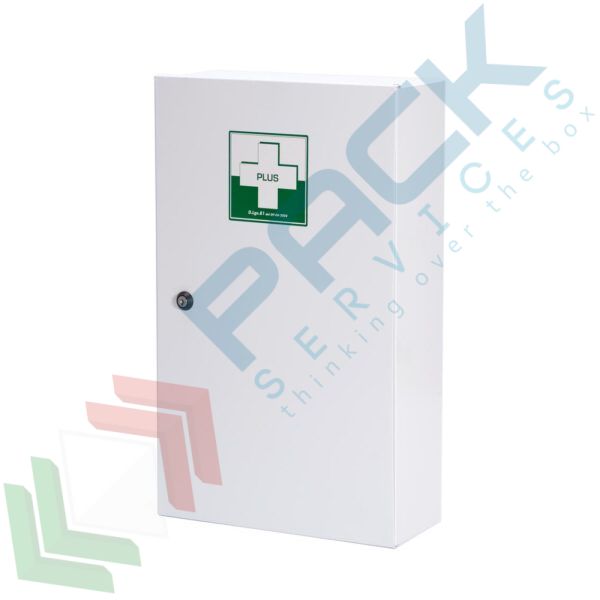 Armadio pronto soccorso in metallo completo del contenuto previsto dall'allegato 1 del D.M. 388 del 15 luglio 2003 e D.L. 81 del 09 aprile 2008 art. 45 , obbligatorio quindi per aziende o unità produttive del gruppo A e B con più di 3 lavoratori. Armadietto pronto soccorso realizzato in in acciaio al carbonio la cui verniciatura garantisce una lunga durata e resistenza e bordi arrotondati per evitare lesioni accidentali durante l’uso. L'armadietto primo soccorso dispone di due ripiani in acciaio per organizzare i prodotti di pronto soccorso e un'anta dotata di tre scaffali per una maggiore capacità di stoccaggio. Base porta flaconi rimovibile per una facile pulizia e manutenzione. Serratura con chiave per garantire la sicurezza e l’accesso controllato ai prodotti di pronto soccorso. Misura 32 x 50,5 x 12 cm. L'armadio primo soccorso prevede un contenuto maggiorato, intatti, oltre al contenuto base specificato dall'allegato 1 del DM 388 (cerotti, guanti, garze, termometro, forbici e molto altro) contiene un'aggiunta di prodotti di riconosciuta utilità. Grazie a questa maggiorazione, la cassetta primo soccorso risulta particolarmente indicata per grandi comunità, aziende commerciali ed industriali, ristoranti, scuole, alberghi e villaggi turistici.