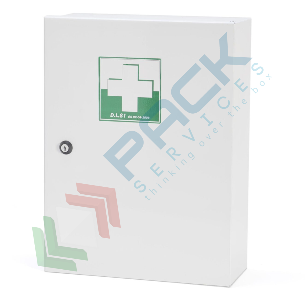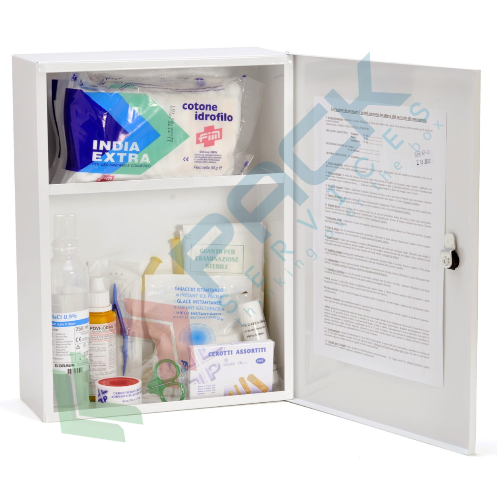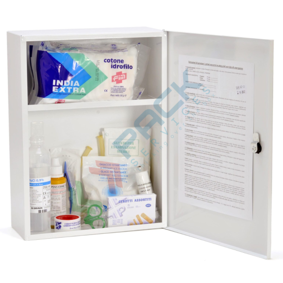 Armadio pronto soccorso in metallo completo del contenuto previsto dall'allegato 2 del D.M. 388 del 15 luglio 2003 e D.L. 81 del 09 aprile 2008 art. 45, obbligatorio quindi per aziende o unità produttive del gruppo C con meno di tre lavoratori. L’art.2 punto 5 del DM 388 del 15.7.2003 prevede che il contenuto dell’allegato 2 deve essere fornito anche ai lavoratori che operano in luoghi diversi dalla sede aziendale o unità produttiva. Armadietto pronto soccorso realizzato in metallo verniciato con polvere epossidica, 1 ripiano, 2 vani, con serratura con chiave, misura 400 L x 300 P x 120 H mm. Il contenuto dell'armadietto è maggiorato, infatti è composto dai prodotti elencati nell'allegato 2, quindi tutti gli strumenti indispensabili in caso di emergenza come cerotti, disinfettanti, ghiaccio, bende e da una maggiorazione composta dai prodotti ad alto consumo o/e utilità.