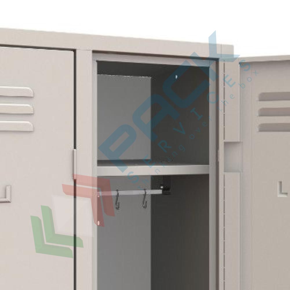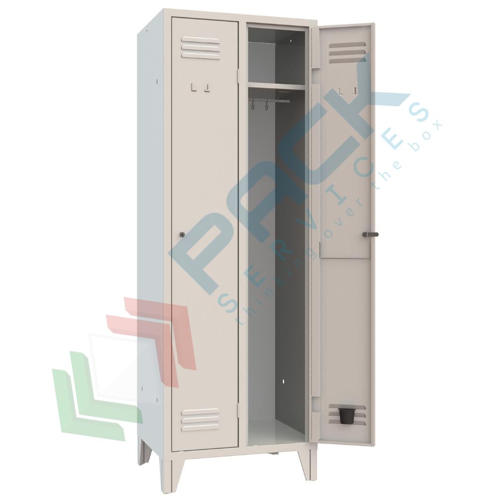 Armadietto spogliatoio salva spazio su 4 piedini realizzato in lamiera d’acciaio profilata prima scelta spessore 6/10. Armadio spogliatoio 2 vani e 1 ripiano, Mis. 600 L x 500 P x 1800 H mm. Armadio metallico spogliatoio con ante rinforzate dotate di feritoie di aerazione nella parte superiore ed inferiore e cerniere interne speciali antiscasso. Bordo frontale perimetrale arrotondato anti urto raggio 6 mm e nervature longitudinali su fianchi e porte. Armadio metallico con asole sul tetto per consentire un’ottima circolazione dell’aria. La dotazione interna contenuta in ogni vano comprende: ripiano superiore con sottostante tubo ovale porta grucce in PVC completo di ganci scorrevoli, porta cartellino in materiale plastico applicato all’anta. Armadietto per palestra con corpo e ante nel colore grigio RAL 7035 e sistema di chiusura con maniglia in metallo lucchettabile a frizione con sistema anti effrazione. Consegnato già montato.