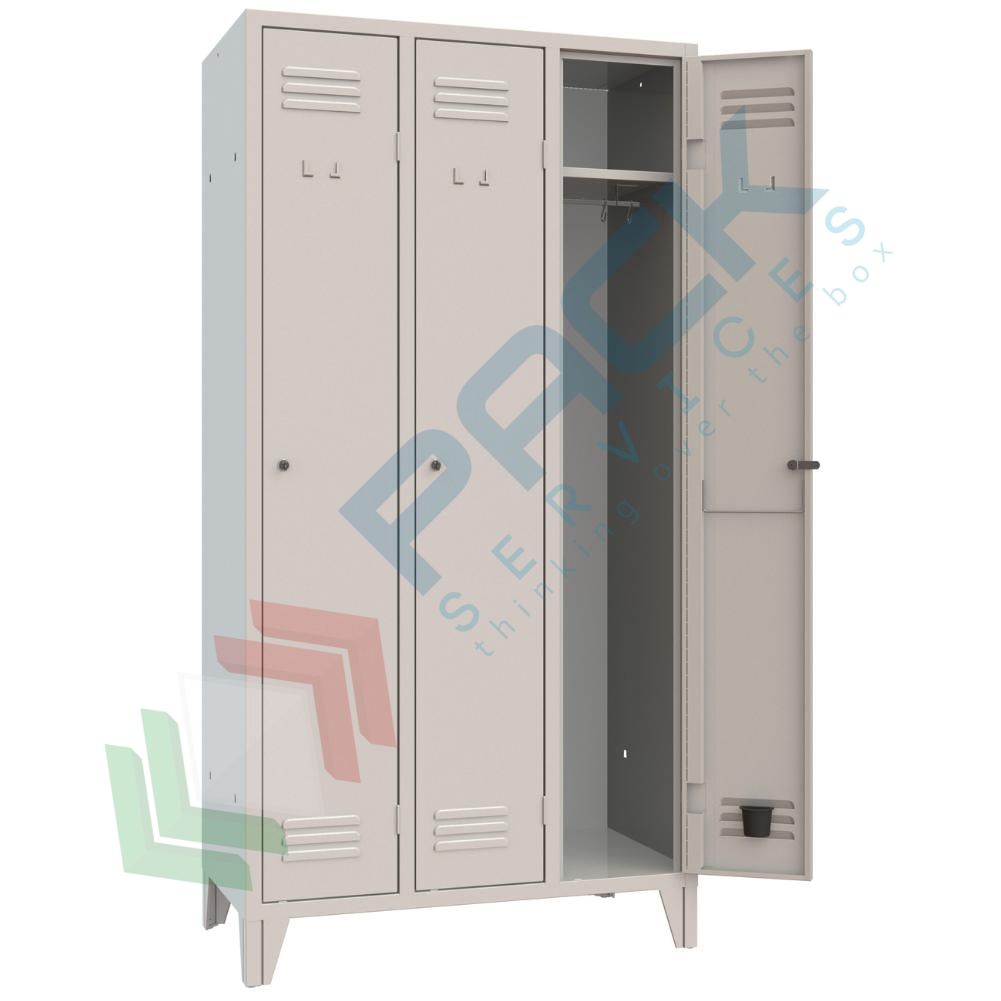 Armadietto spogliatoio con 3 vani e 1 ripiano, Mis. 907 L x 500 P x 1800 H mm. Armadio metallico spogliatoio con ante dotate di cerniere interne con perno di rotazione esterno a 180 °, canottatura di rinforzo sul lato, cerniere e pieghe antitaglio su tre ordini sui lati rimanenti, feritoie di aerazione superiori e inferiori, portacartellino stampato. Armadio metallico con corpo formato da pannellatura unica tra tetto e schiena unito tramite microgiunzione, a creare asole per l'aerazione e fianchi spessore frontale 30 mm. La dotazione interna contenuta in ogni vano comprende: ripiano superiore ad 247 h mm dal tetto con asta porta grucce dotata di due ganci a "S" in acciaio zincato. Filo porta ombrelli/asciugamani in tondino d'acciaio cromato montato sull'anta. Vaschetta in materiale plastico raccogli gocce. Armadietto per palestra con corpo e ante nel colore grigio RAL 7035 e sistema di chiusura con serratura a cilindro tipo Yale con doppia chiave antitrauma in dotazione. Consegnato già montato.