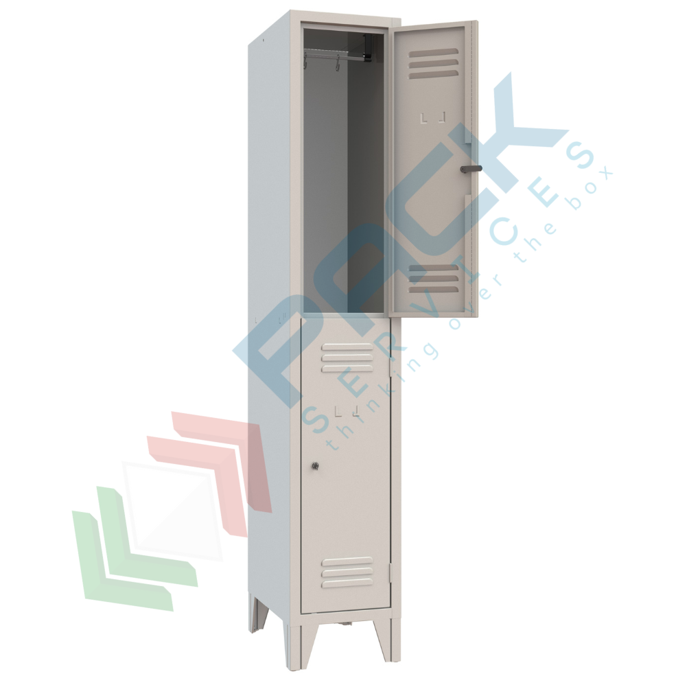 Armadietto spogliatoio sovrapposto in metallo a 2 vani, Mis. 322 L x 500 P x 1800 H mm, realizzato in metallo, 4 piedi d'appoggio metallici. L'armadio sovrapposto monoblocco ha il corpo formato da pannellatura unica tra tetto e schiena unito tramite microgiunzione, a creare asole per l'aerazione e fianchi spessore frontale 30 mm.con bordi antitaglio piegati su tre ordini. Ante dotate di cerniere interne con perno di rotazione esterno a 180 °. Armadio metallico con chiusura tramite maniglia in metallo lucchettabile.