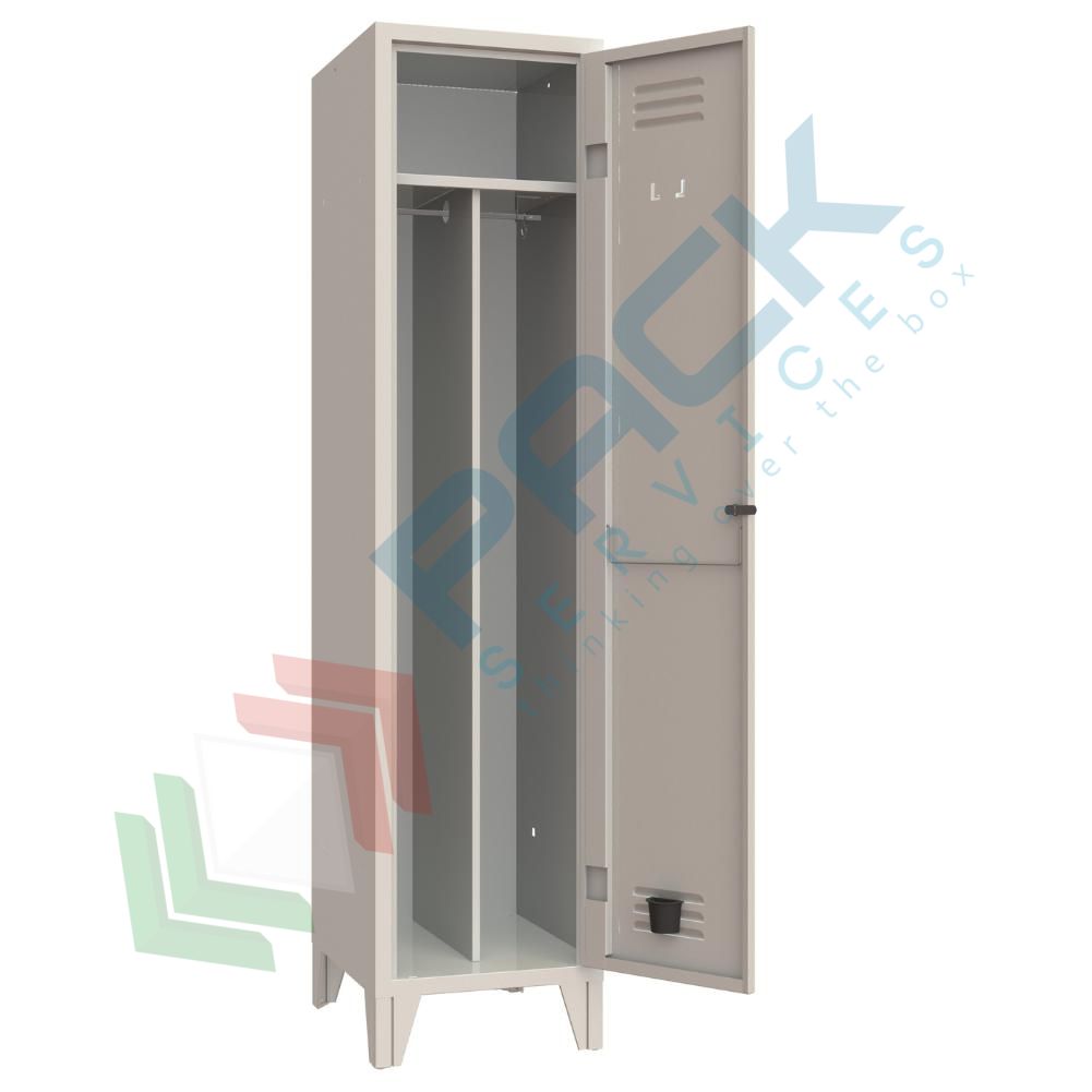 Armadietto spogliatoio sporco pulito su 4 piedini realizzato in lamiera d’acciaio, 1 vano, Mis. 420 L x 500 P x 1800 H mm. Armadio metallico sporco pulito con corpo formato da pannellatura unica tra tetto e schiena unito tramite microgiunzione, a creare asole per l'aerazione e fianchi spessore frontale 30 mm con bordi antitaglio piegati su tre ordini. La dotazione interna contenuta in ogni vano comprende: ripiano superiore ad h 247 mm dal tetto con asta porta grucce dotata di due ganci a "S" in acciaio zincato. Divisorio tra ripiano e fondo. Filo porta ombrelli/asciugamani in tondino d'acciaio cromato montato sull'anta. Vaschetta in materiale plastico raccogli gocce. Armadio per palestra con corpo e ante nel colore grigio RAL 7035 e sistema di chiusura con serratura a cilindro tipo Yale con doppia chiave antitrauma in dotazione. Consegnato già montato.