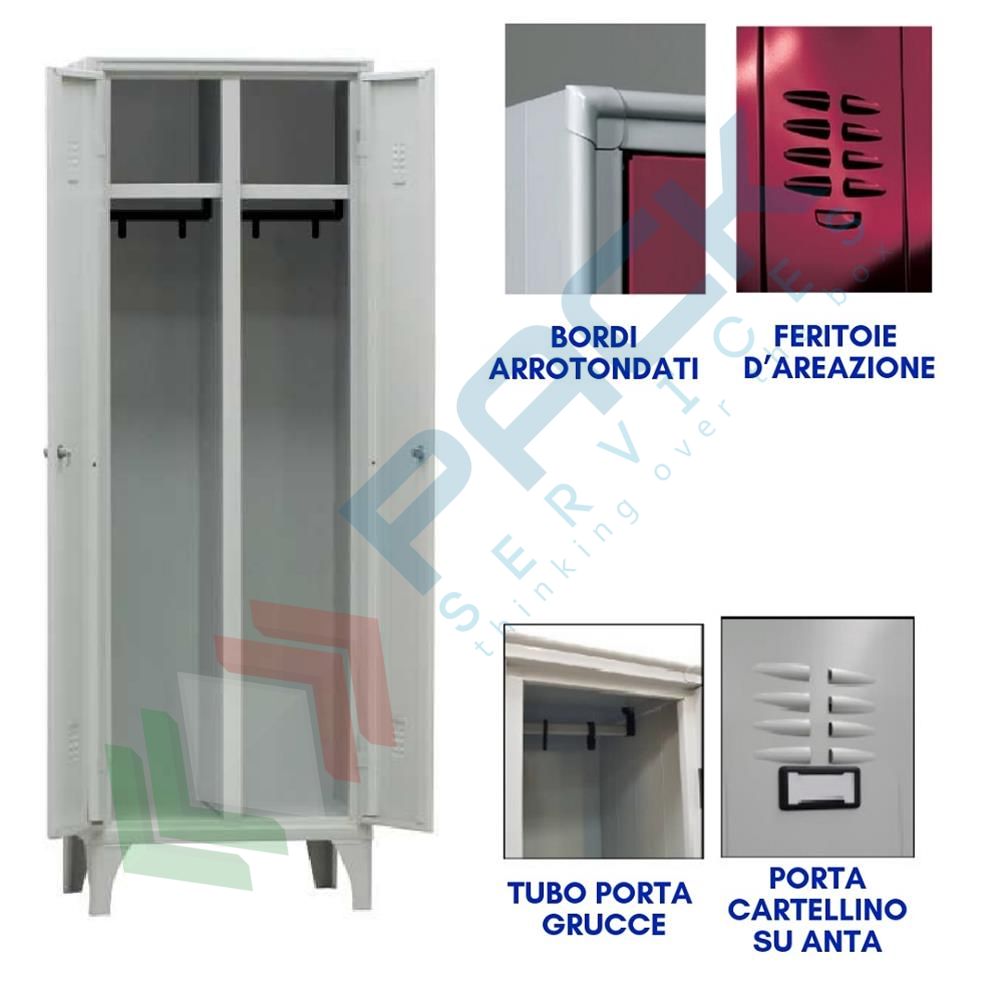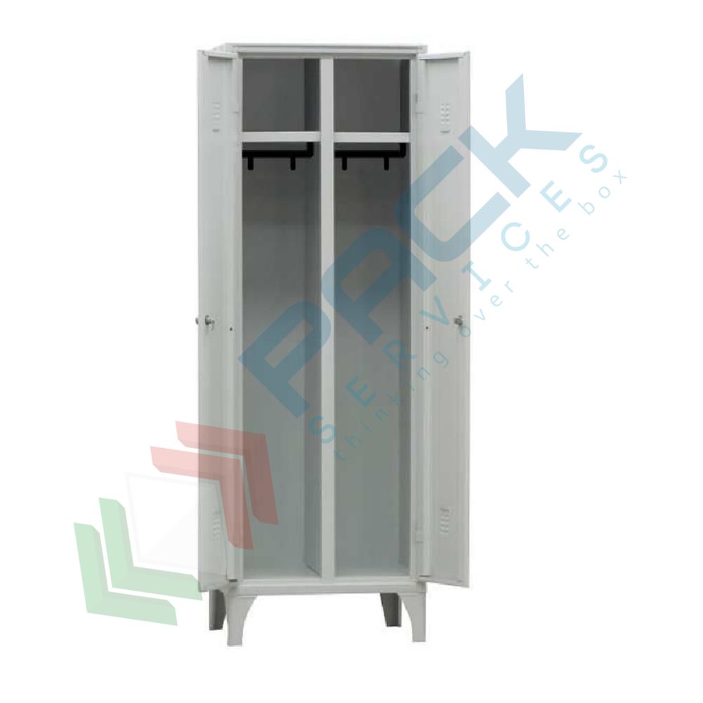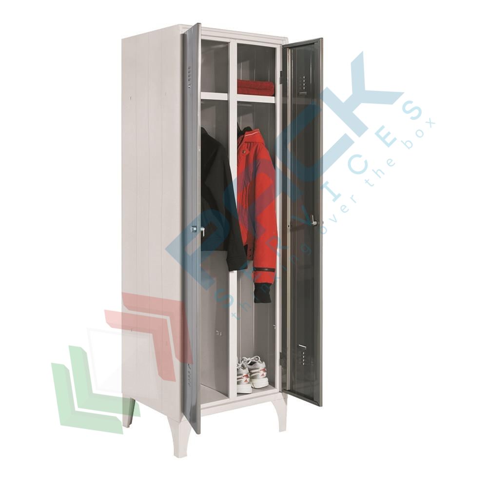 Armadietto spogliatoio sporco pulito su 4 piedini realizzato in lamiera d’acciaio, 2 vani, Mis. 615 L x 500 P x 1800 H mm. Armadio metallico sporco pulito con corpo formato da pannellatura unica tra tetto e schiena unito tramite microgiunzione, a creare asole per l'aerazione e fianchi spessore frontale 30 mm con bordi antitaglio piegati su tre ordini. La dotazione interna contenuta in ogni vano comprende: doppio ripiano superiore ad h 247 mm dal tetto con asta porta grucce dotata di due ganci a "S" in acciaio zincato. Filo porta ombrelli/asciugamani in tondino d'acciaio cromato montato sull'anta Dx. Vaschetta in materiale plastico raccogli gocce su anta Dx. Armadietto per palestra con corpo e ante nel colore grigio RAL 7035 e sistema di chiusura con maniglia in metallo lucchettabile. Consegnato già montato.