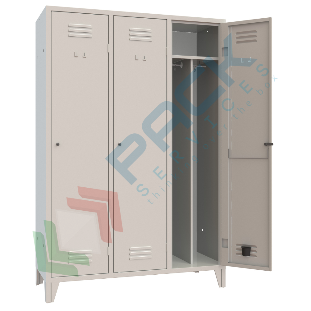 Armadietto spogliatoio sporco pulito su 4 piedini realizzato in lamiera d’acciaio, 3 vani, Mis.1200 L x 500 P x 1800 H mm. Armadio metallico sporco pulito con corpo formato da pannellatura unica tra tetto e schiena unito tramite microgiunzione a creare asole per l'aerazione e fianchi spessore frontale 30 mm con bordi antitaglio piegati su tre ordini. La dotazione interna contenuta in ogni vano comprende: ripiano superiore ad h 247 mm dal tetto con asta porta grucce dotata di due ganci a "S" in acciaio zincato. Divisorio tra ripiano e fondo. Filo porta ombrelli/asciugamani in tondino d'acciaio cromato montato sull'anta. Vaschetta in materiale plastico raccogli gocce. Armadietto per palestra con corpo e ante nel colore grigio RAL 7035 e sistema di chiusura con serratura a cilindro tipo Yale con doppia chiave antitrauma in dotazione. Consegnato già montato.