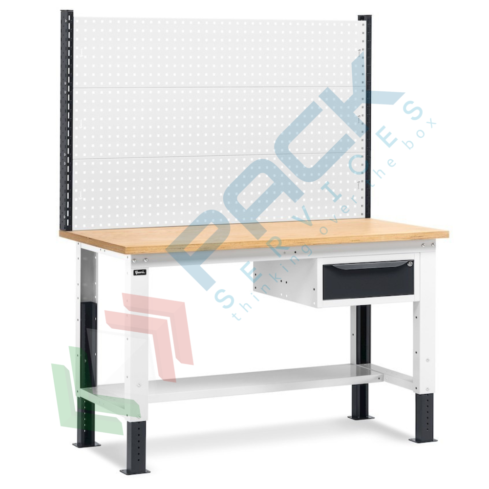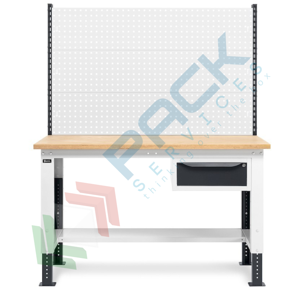 Banco da lavoro piano in legno con gambe regolabili, 1 cassetto e parete attrezzata, Mis. 1500 L x 750 P x 740/1100 H mm, colore antracite/grigio chiaro