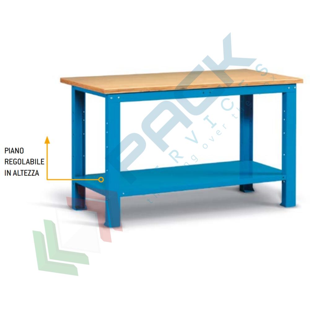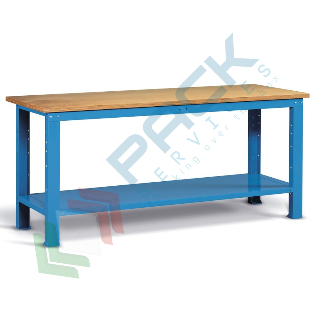 Banco da lavoro in acciaio, realizzato con piano in multiplex 30mm, Mis. 1500 L x 750 P x 882 H mm, con piano inferiore regolabile in altezza. Carico massimo del prodotto 1000 Kg. Fornito smontato. Il banco con piano in legno è una soluzione ideale per effettuareoperazioni pesanti. La postazione di lavoro può essere trasformata nel tempo a seconda delle necessità dell'utilizzatore, infatti può essere arricchito da cassetti, armadi con porta o semipiani per realizzare una postazione di lavoro professionale che si adatta alle mutevoli esigenze lavorative. Colore lamiera in acciaio blu RAL 5012.