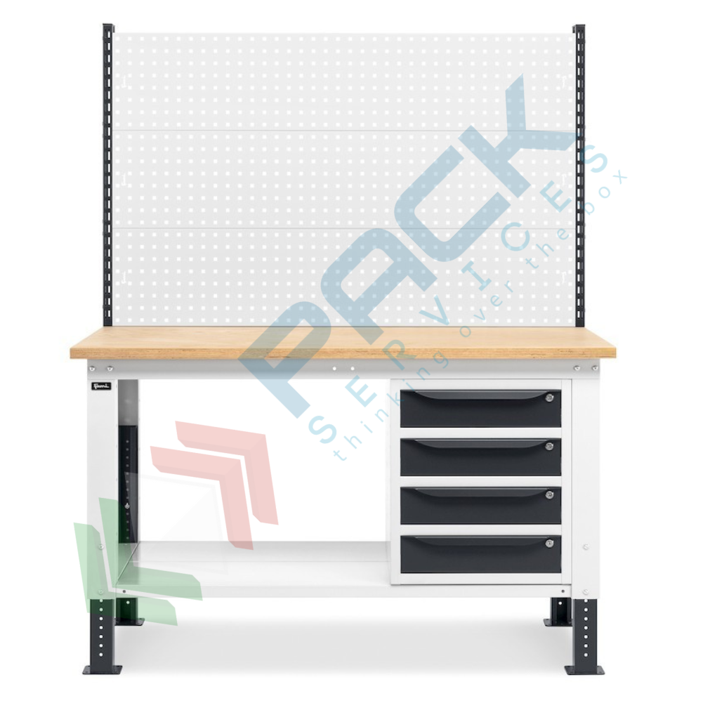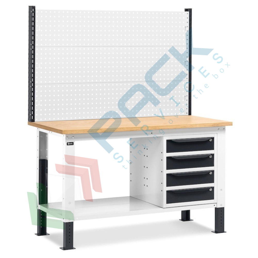 Banco da lavoro piano in legno con gambe regolabili, 4 cassetti e parete attrezzata, Mis. 1500 L x 750 P x 740/1100 H mm, colore antracite/grigio chiaro