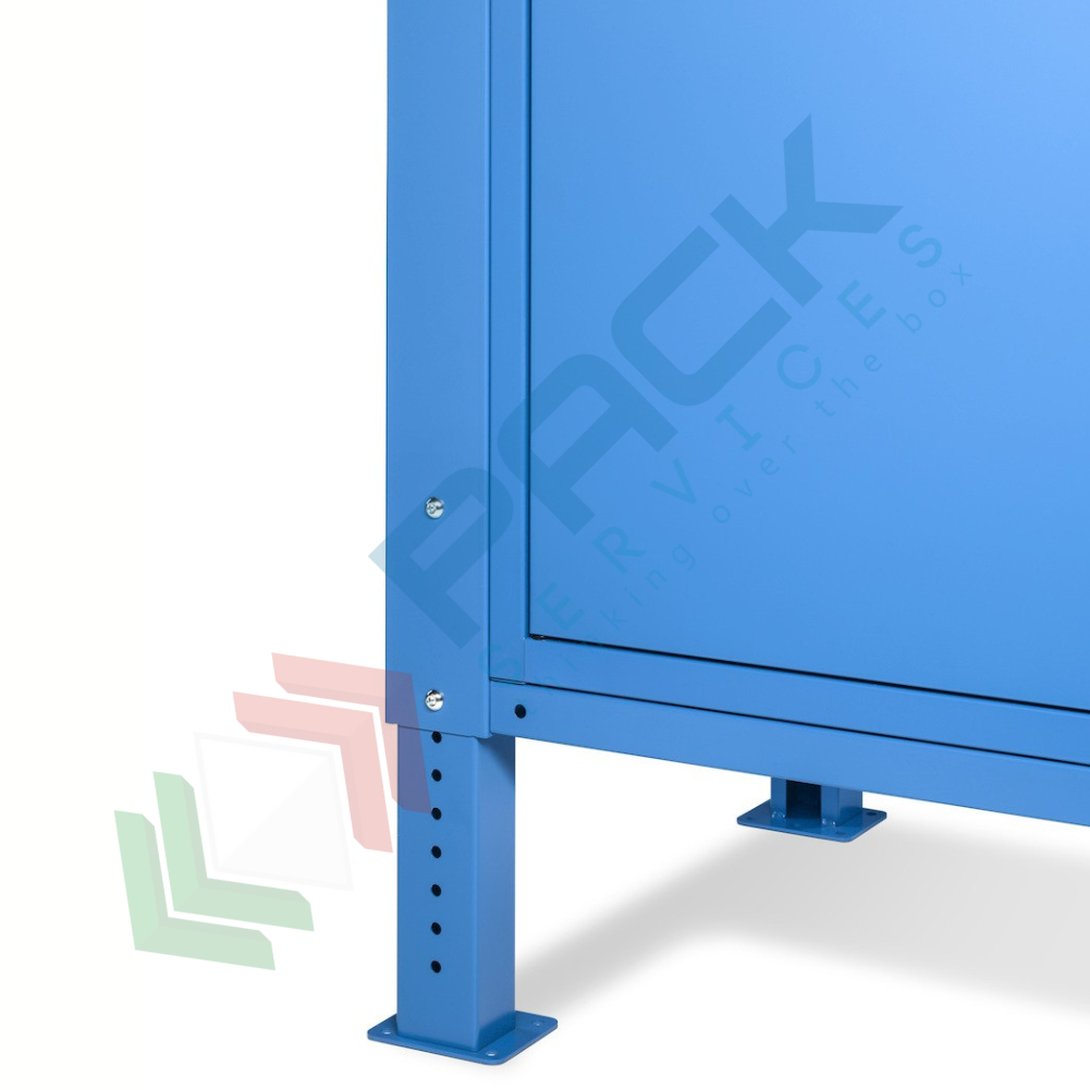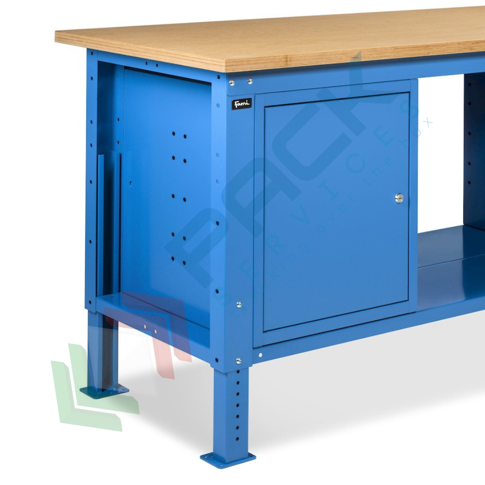 Banco da lavoro in acciaio, realizzato con piano in multiplex 30 mm, Mis. 2000 L x 750 P x 740/1110 H mm, con gambe regolabili in altezza. Carico massimo del prodotto 1000 Kg. Fornito smontato. L'altezza del banco da lavoro con piano in multiplex può essere facilmente variata meccanicamente per regolare il piano di lavoro non solo in base alle lavorazioni da effettuare, ma anche secondo l'altezza dell'operatore. Il banco con piano in legno è una soluzione ideale per effettuare operazioni pesanti. Questa configurazione del banco da lavoro regolabile in altezza offre numerose soluzioni per l'organizzazione e lo stoccaggio di tutto ciò che quotidianamente è utilizzato per il lavoro. Utensili, attrezzatura e componenti possono essere comodamente inseriti all'interno dell'armadio a 4 cassetti o dell'armadio con porta e piano regolabile. La parte superiore del banco presenta una serie di pannelli forati che possono essere utilizzati come parete attrezzata o come mensole se installati in posizione orizzontale o inclinata. Colore lamiera in acciaio blu RAL 5012.