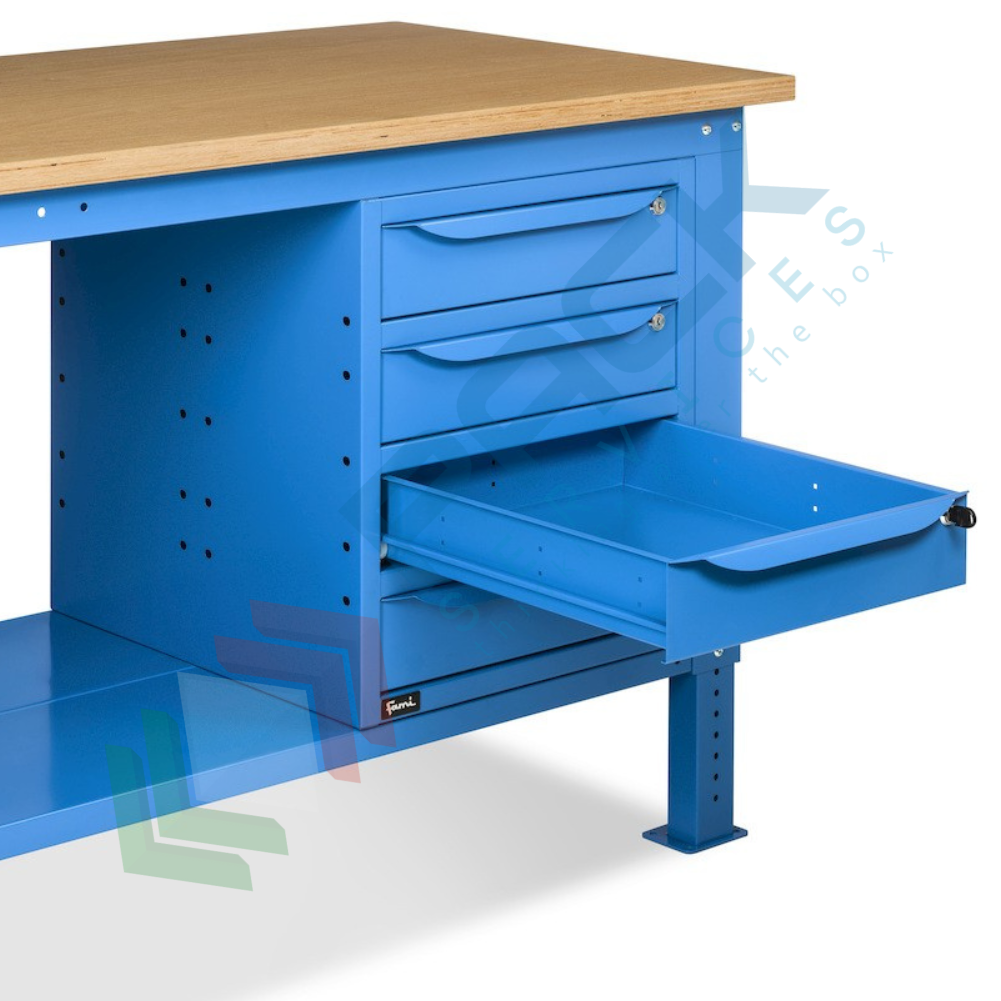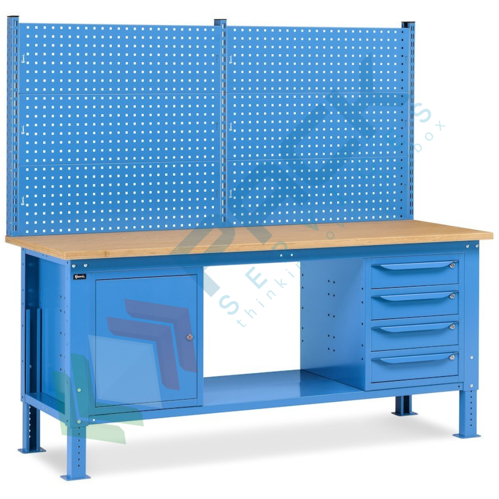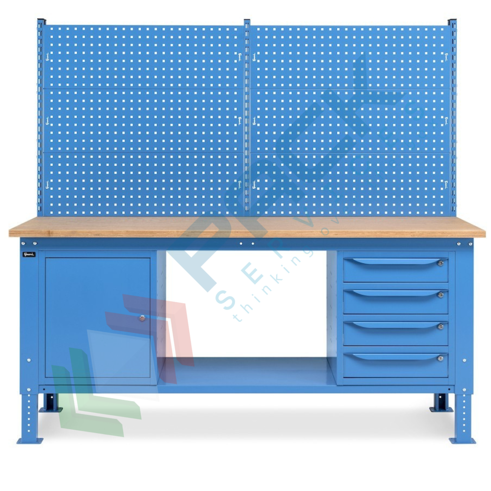 Banco da lavoro piano in legno con gambe regolabili, parete attrezzata, 4 cassetti e 1 con porta, Mis. 2000 L x 750 P x 740/1100 H mm, colore blu