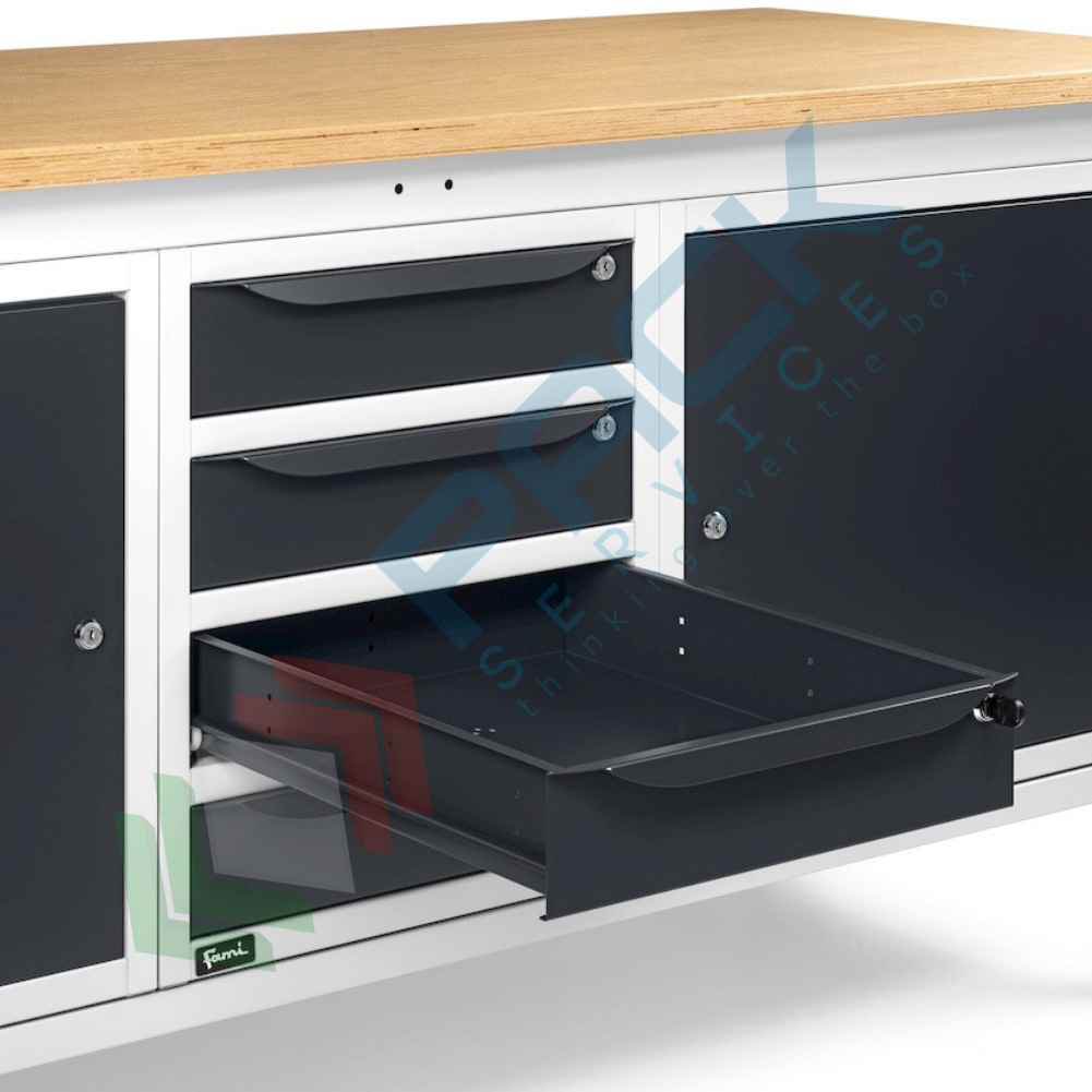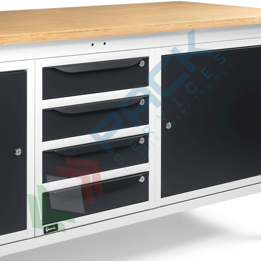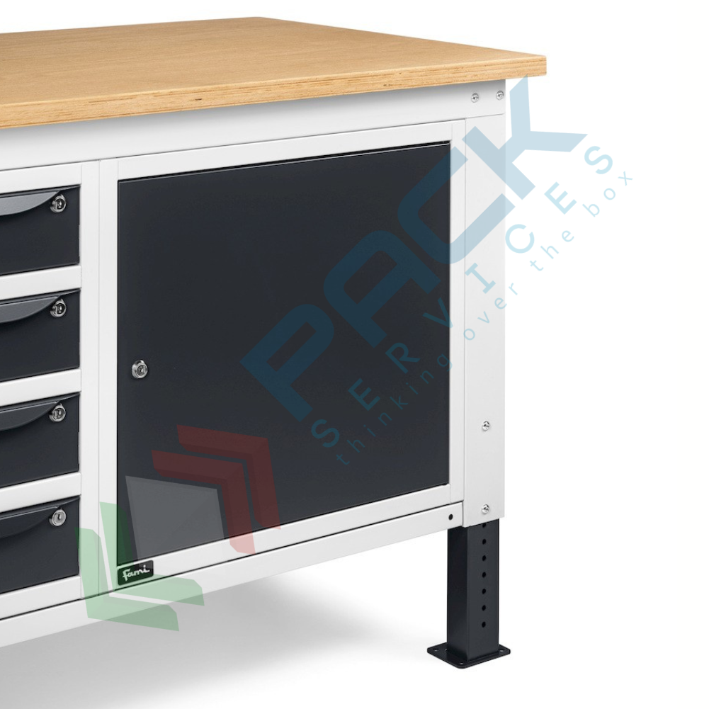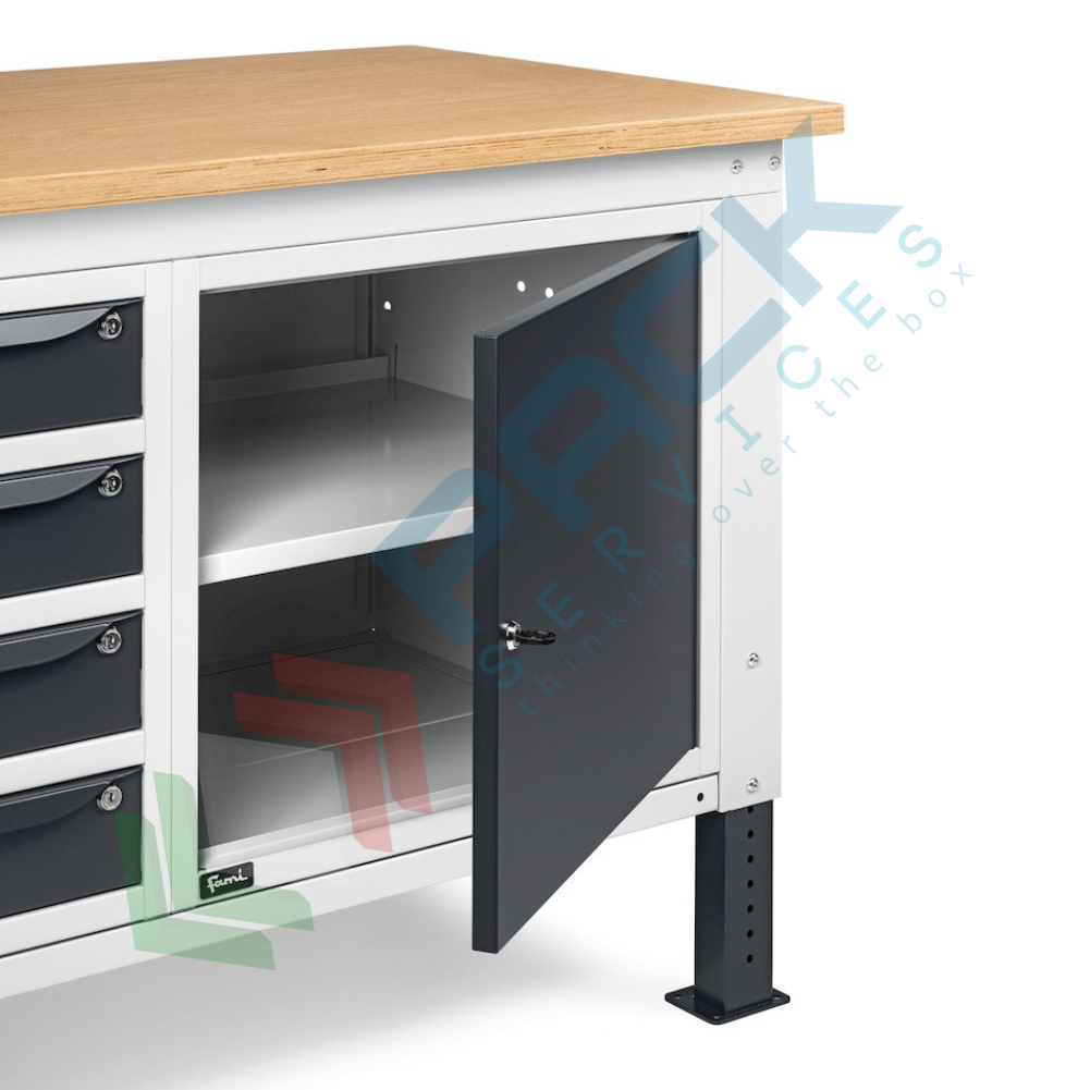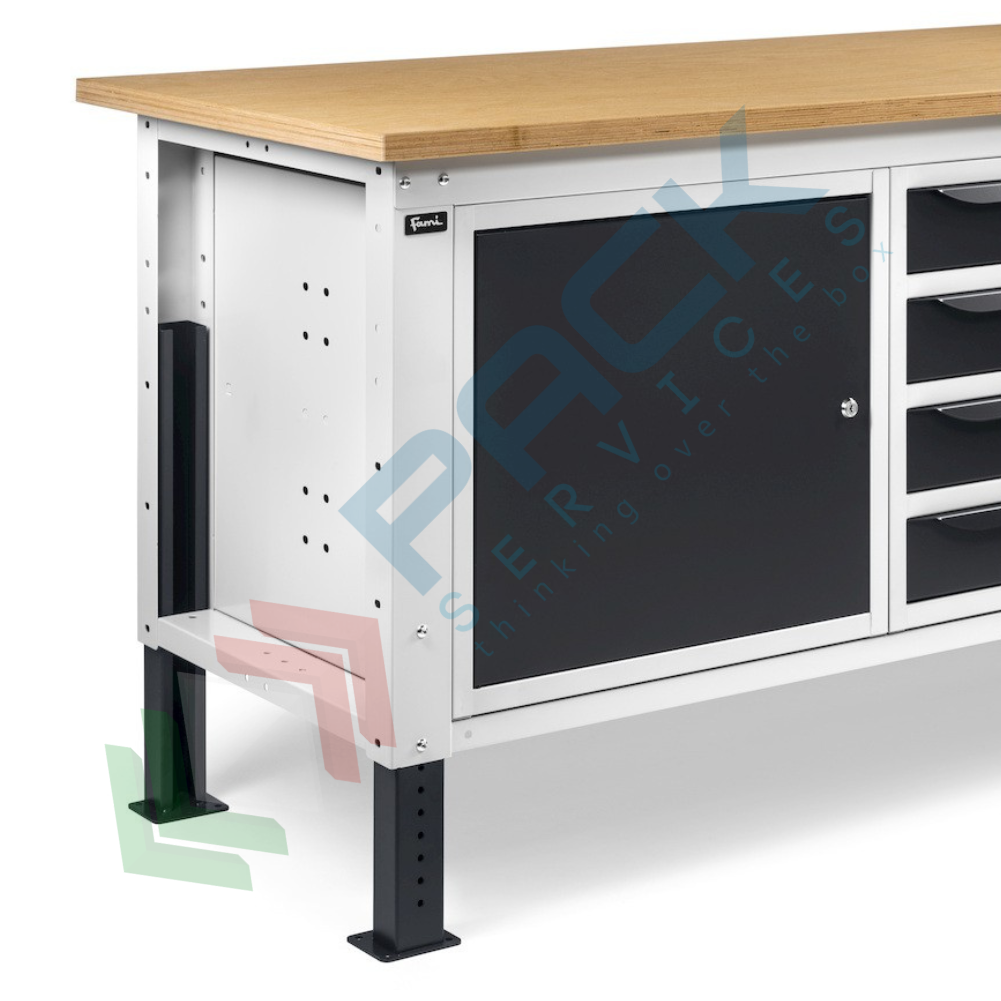 Banco da lavoro in acciaio, realizzato con piano in multiplex 30 mm, Mis. 2000 L x 750 P x 740/1110 H mm, con gambe regolabili in altezza. Carico massimo del prodotto 1000 Kg. Fornito smontato. L'altezza del banco da lavoro con piano in multiplex può essere facilmente variata meccanicamente per regolare il piano di lavoro non solo in base alle lavorazioni da effettuare, ma anche secondo l'altezza dell'operatore. Il banco con piano in legno è una soluzione ideale per effettuare operazioni pesanti. Il banco da lavoro regolabile in altezza presenta un sistema di pannelli forati 10x10 mm nella parte superiore e un armadio a 4 cassetti e due armadi con porta nella parte inferiore. Tutte le soluzioni presenti in questo banco sono ideate per rendere il lavoro più organizzato ed efficiente grazie alla possibilità di destinare specifiche aree al contenimento di determinati utensili, attrezzature o componenti. Gli armadi sono dotati di serratura con chiusura a cilindro per custodire in sicurezza il materiale stoccato. Colore lamiera in acciaio grigio antracite RAL 7016 + grigio chiaro RAL 7035.