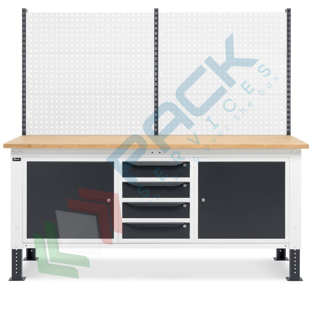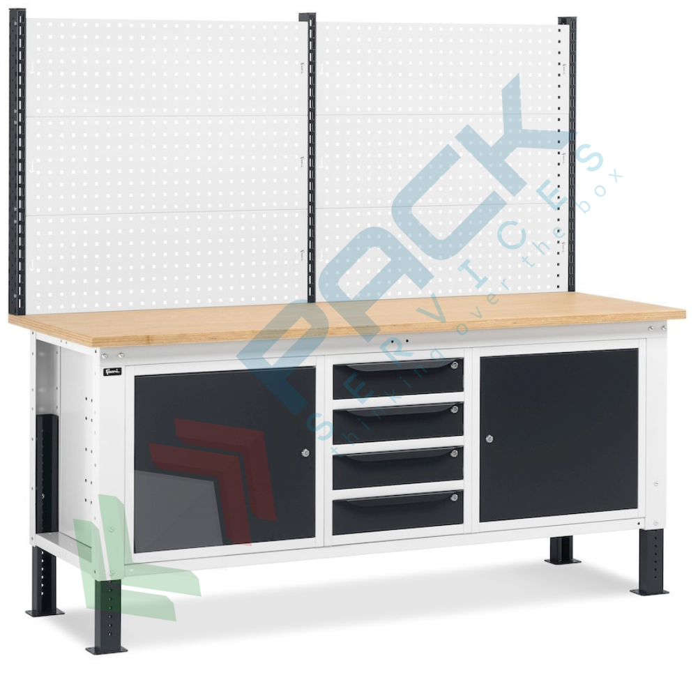 Banco da lavoro piano in legno con gambe regolabili, parete attrezzata, 4 cassetti e 2 con porta, Mis. 2000 L x 750 P x 740/1100 H mm, colore antracite/grigio chiaro