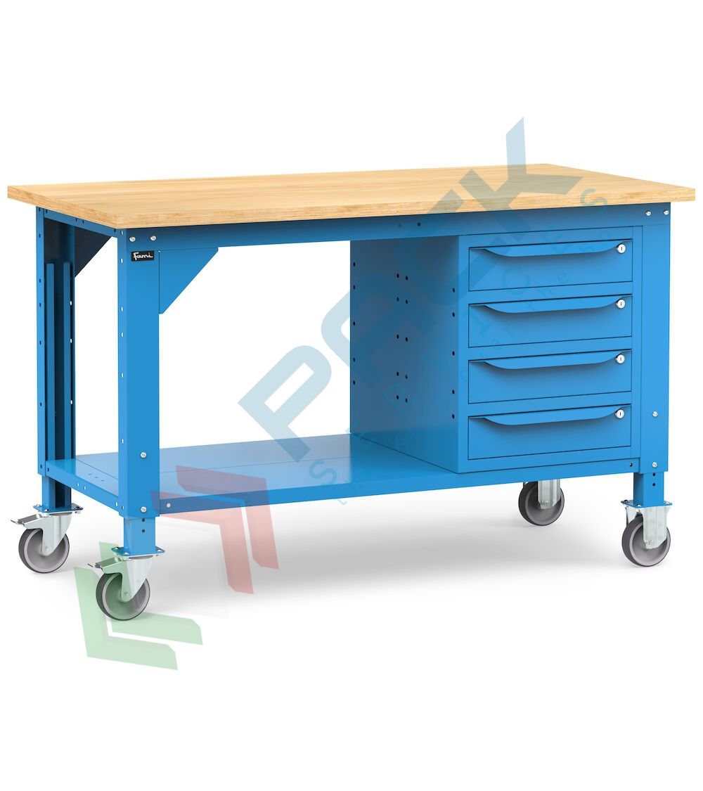 Banco da lavoro con ruote, piano in legno e 4 cassetti, gambe regolabili in altezza, Mis. 1500 L x 750 P x 887/1262 H mm, colore blu
