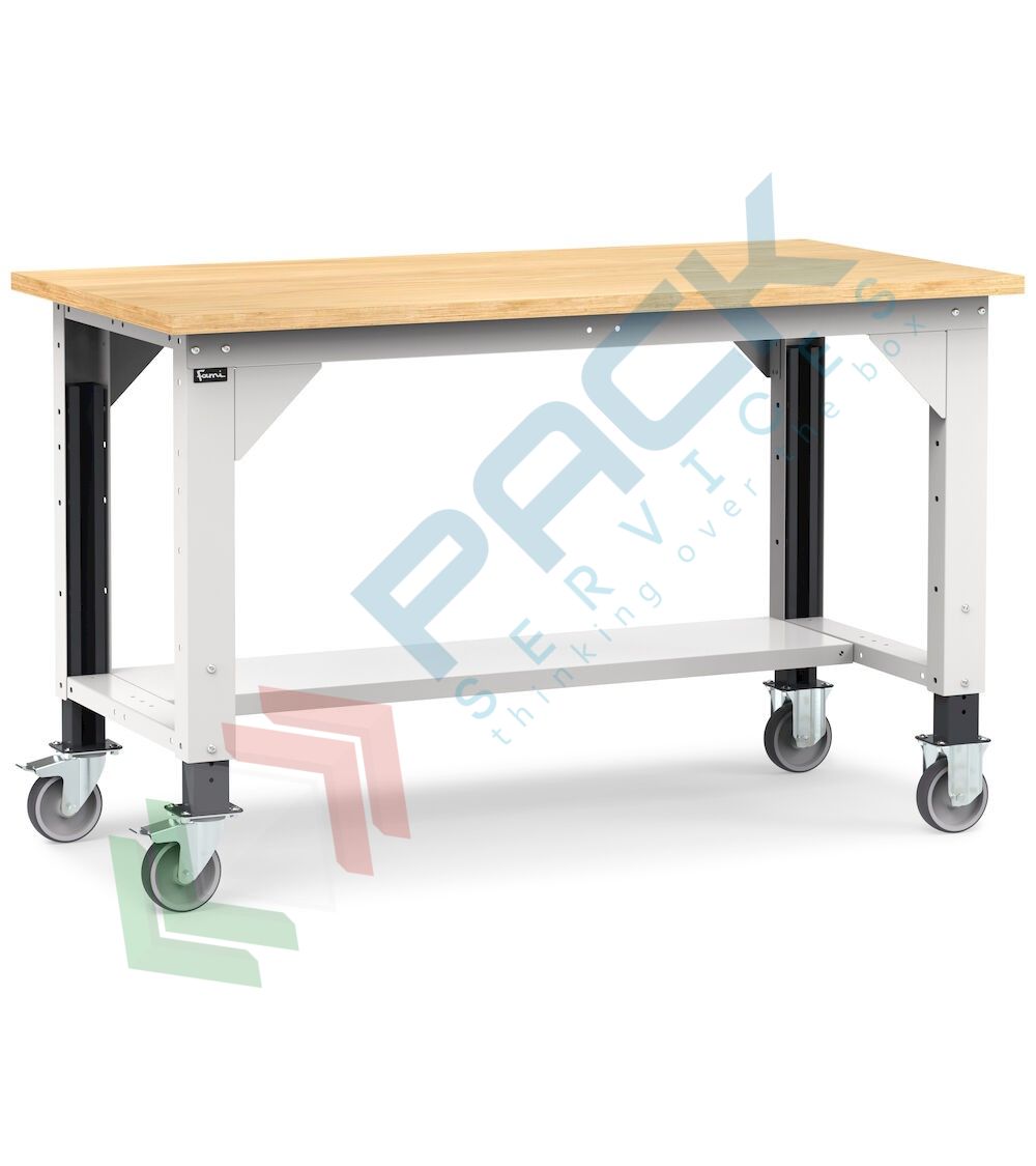 Banco da lavoro con ruote, piano in legno con gambe regolabili in altezza, Mis. 1500 L x 750 P x 887/1262 H mm, colore grigio