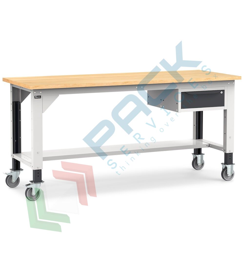Banco da lavoro con ruote, piano in legno e 1 cassetto, gambe regolabili in altezza, Mis. 2000 L x 750 P x 887/1262 H mm, colore grigio