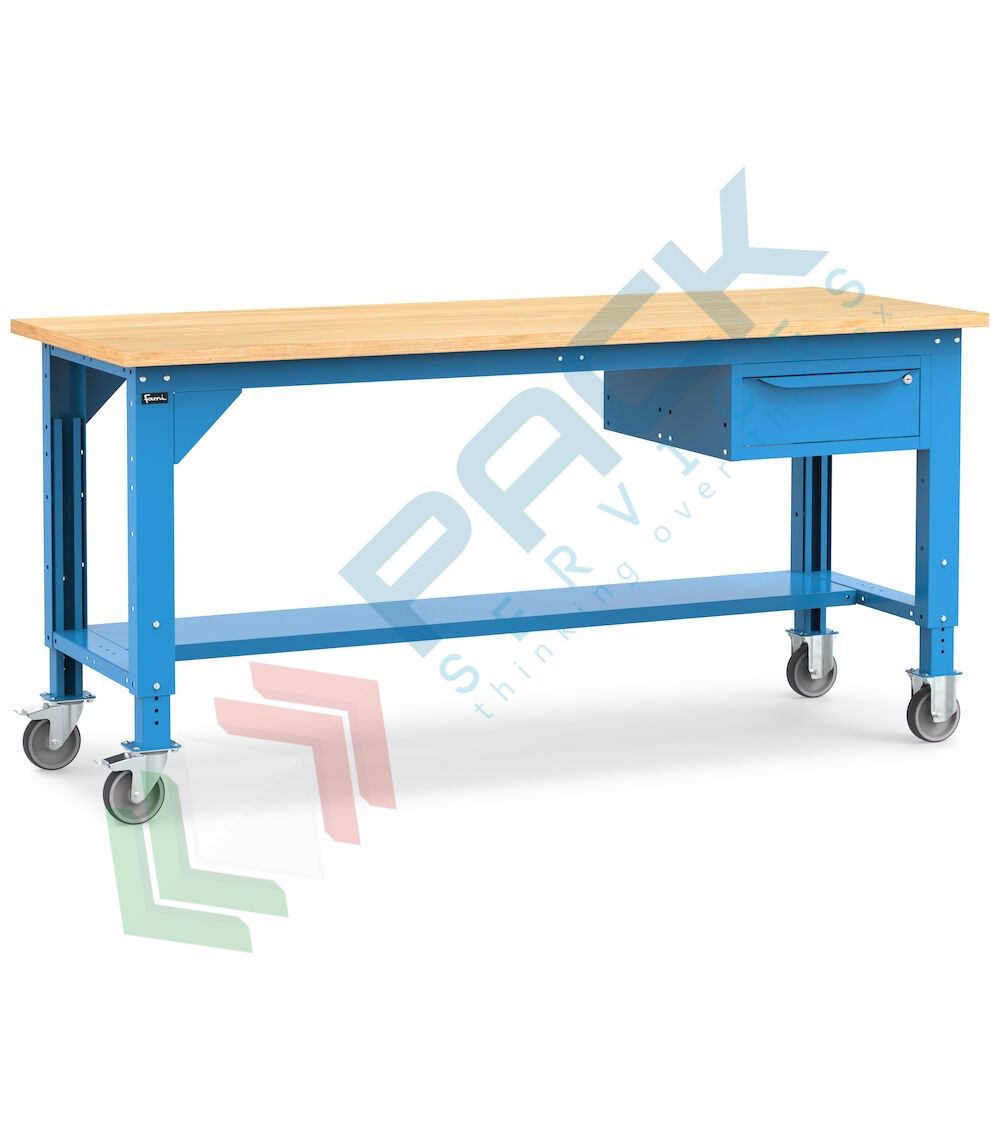 Banco da lavoro con ruote, piano in legno e 1 cassetto, gambe regolabili in altezza, Mis. 2000 L x 750 P x 887/1262 H mm, colore blu