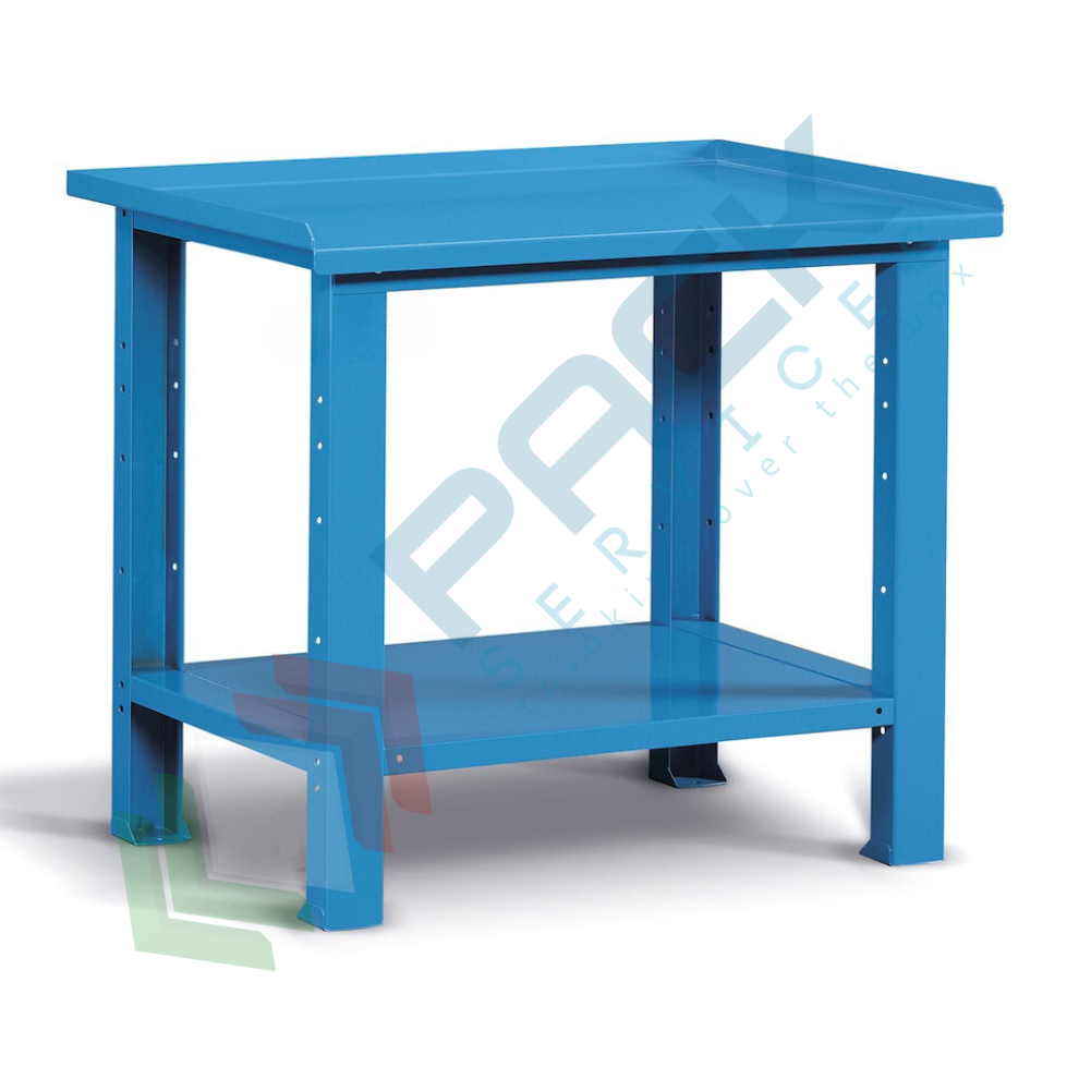 Banco da lavoro in acciaio, realizzato con piano in acciaio, Mis. 1031 L x 704 P x 887 H mm, con piano inferiore regolabile in altezza. Carico massimo del prodotto 1000 Kg. Fornito smontato. Il banco con piano in acciaio è una componente fondamentale nell'officina, in reparto o nelle spedizioni perché consente di raccogliere ordinatamente in un unico luogo tutto il necessario per il lavoro. La postazione di lavoro può essere trasformata nel tempo a seconda delle necessità dell'utilizzatore, infatti può essere arricchito da cassetti, armadi con porta o semipiani per realizzare una postazione di lavoro professionale che si adatta alle mutevoli esigenze lavorative. Il piano in acciaio è resistente ad oli e liquidi non corrosivi. Colore lamiera in acciaio blu RAL 5012.