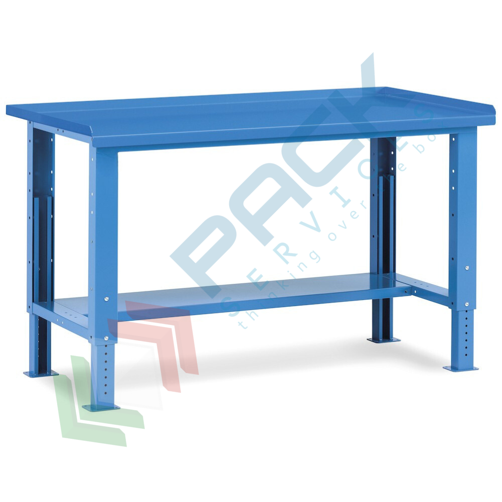 Banco da lavoro in acciaio, realizzato con piano in acciaio, Mis. 1507 L x 704 P x 767/1112 H mm, con gambe regolabili in altezza. Carico massimo del prodotto 1000 Kg. Fornito smontato. Il banco da lavoro con gambe regolabili consente di modificare l'altezza del piano di lavoro in base alle diverse operazioni da effettuare e permette all'operatore di lavorare sia in posizione seduta che in piedi. Il banco con piano in acciaio è una componente fondamentale nell'officina, in reparto o nelle spedizioni perché consente di raccogliere ordinatamente in un unico luogo tutto il necessario per il lavoro. La postazione di lavoro può essere trasformata nel tempo a seconda delle necessità dell'utilizzatore, infatti può essere arricchito da cassetti, armadi con porta o semipiani per realizzare una postazione di lavoro professionale che si adatta alle mutevoli esigenze lavorative. Il piano in acciaio è resistente ad oli e liquidi non corrosivi. Colore lamiera in acciaio blu RAL 5012.